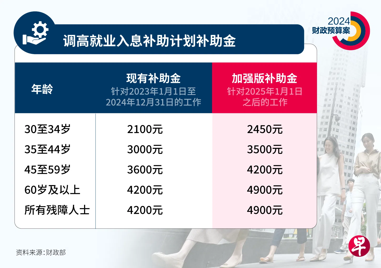 通过加强版的就业入息补助计划(Workfare Income Supplement),最高每年可获得的补助金增至4900元;这项计划的合格月入顶限,也将从2500元调高至3000元,预计让约50万名新加坡员工受惠。