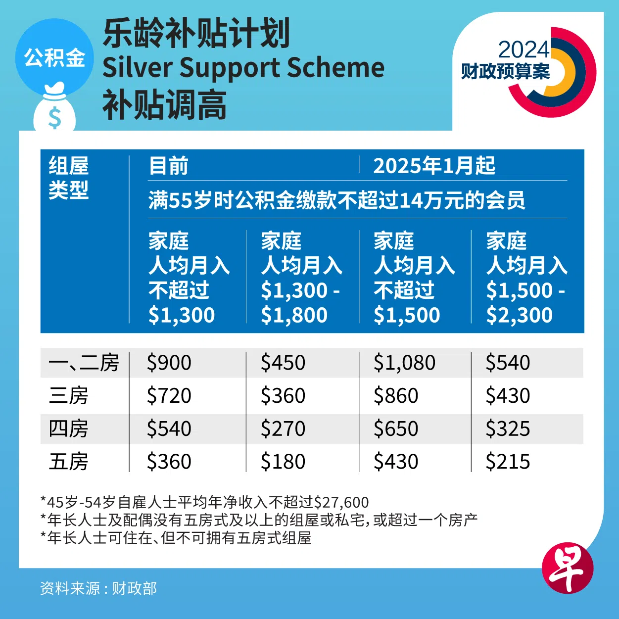 从2025年1月起,增加乐龄补贴计划(Silver Support Scheme)的津贴,除了将每季度可获得的现金补贴增加两成,受惠家庭月入人均收入的顶限也从1800元提高至2300元,以确保低收入年长者能应付通胀。