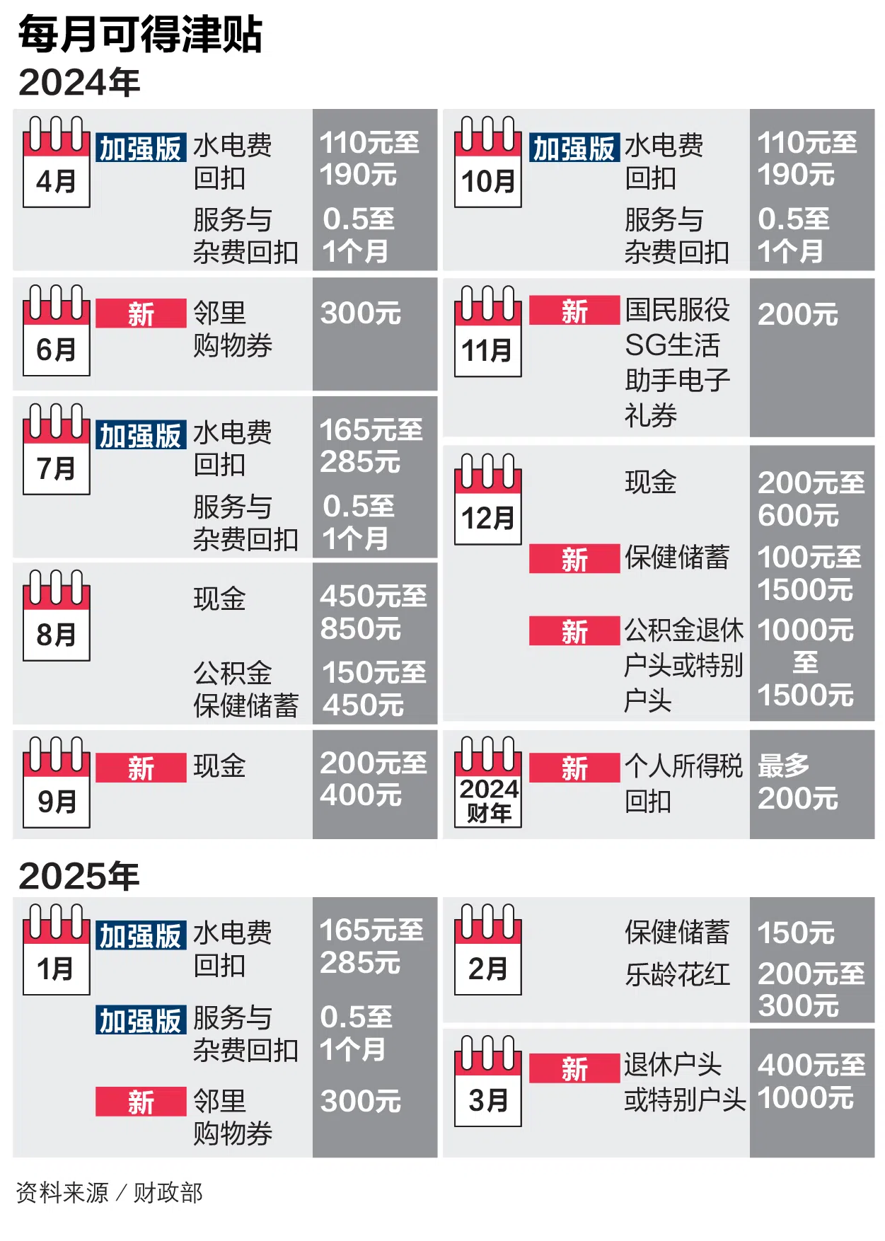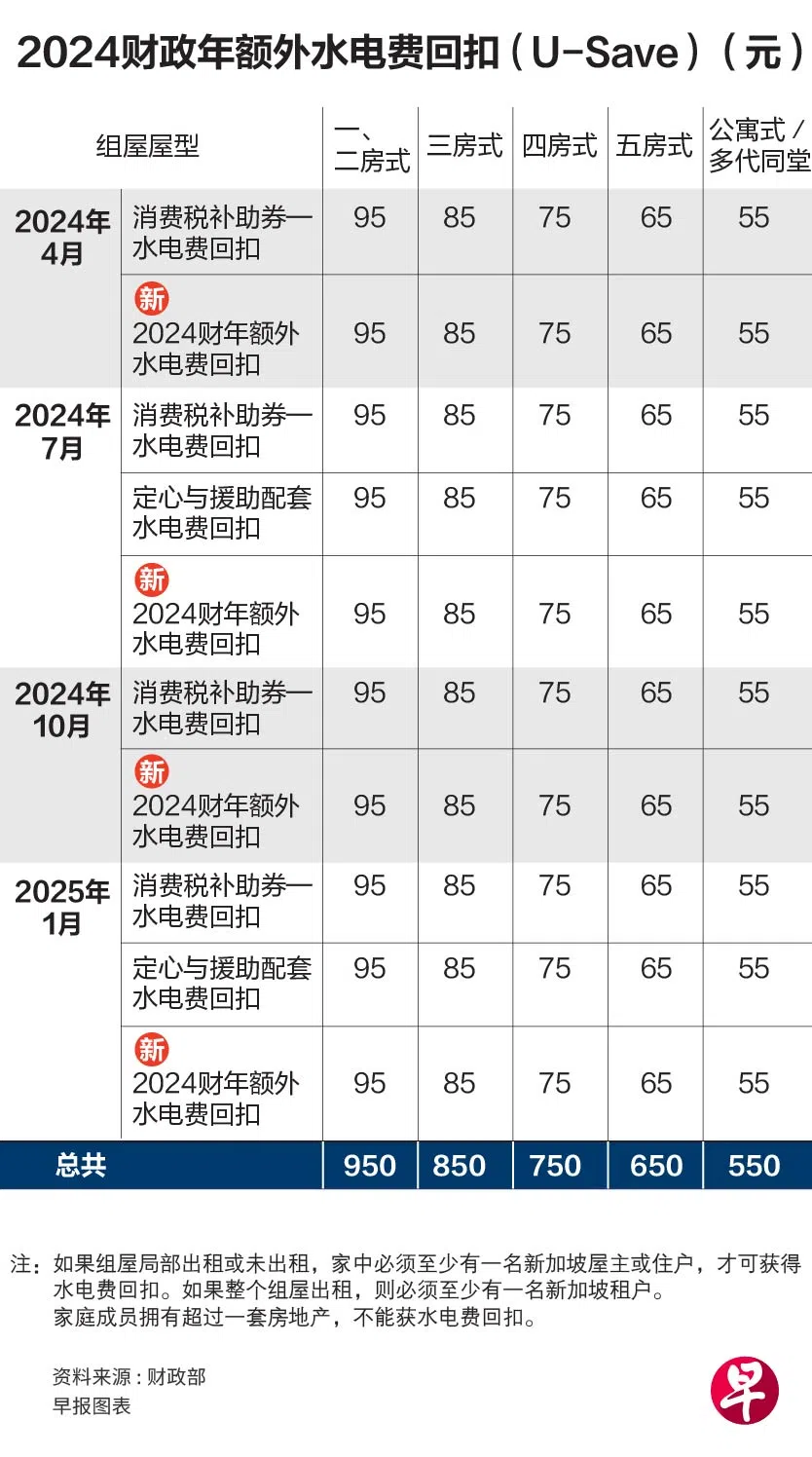 另外,为减轻水电费上涨的影响,住在政府组屋的新加坡家庭可在2024财年额外获得水电费回扣,分四个季度发放,每季发放55元至95元,视屋型而定。这是一笔在定期发放的消费税补助券—水电费回扣(GSTV–U-Save)之外的特别回扣。