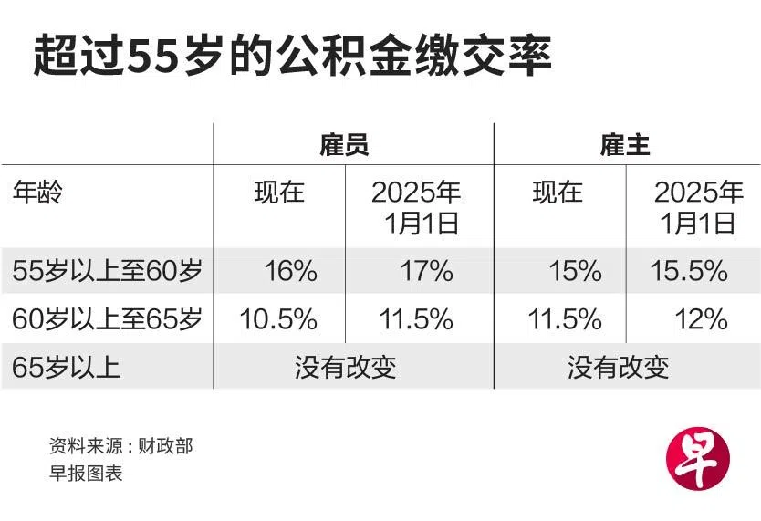 此外,超过55岁至65岁雇员的公积金缴交率,明年将上调1.5个百分点。雇员承担的增幅为1个百分点,而雇主所须承担的0.5个百分点,一半会在过渡性公积金抵消计划(CPF Transition Offset)下,由政府支付,为期一年,以缓冲雇主承受的商业成本冲击。