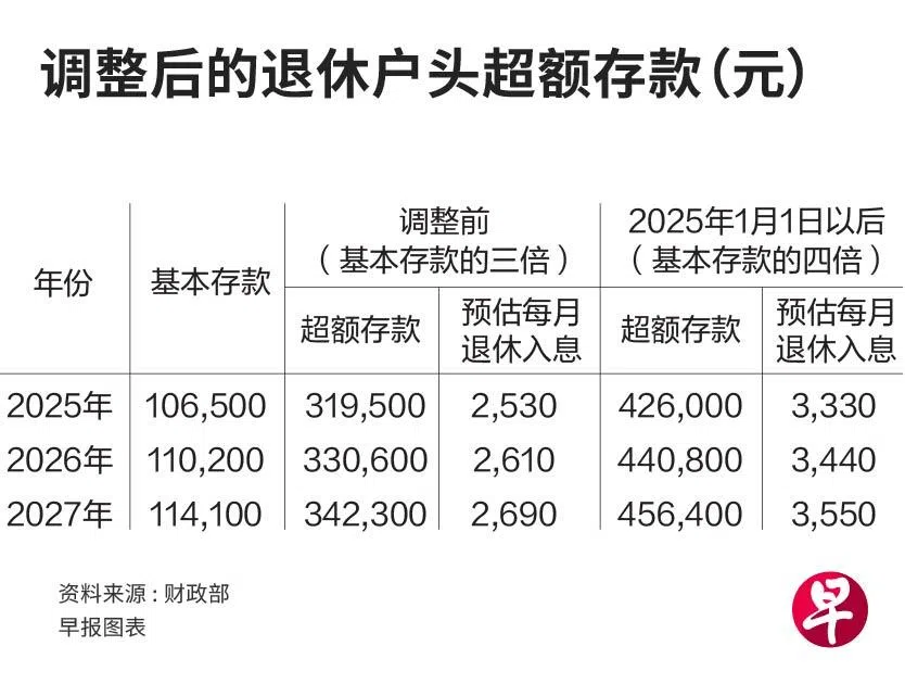 “随着超额存款的顶限从基本存款的三倍增至四倍,约140万名55岁及以上的会员当中,超过99%能把他们在特别户头的全部存款转入退休户头,享受长期利率和更高的入息。”目前,普通户头的存款利率约为2.5%,特别和退休户头则在4%左右。