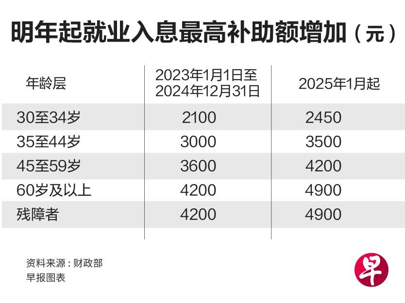 为确保跟上本地工资增长,政府将进一步加强就业入息补助计划。明年1月起,这项旨在援助较低收入者的计划,合格月入顶限将从2500元,调高至3000元,预计可让约50万名新加坡雇员受惠。