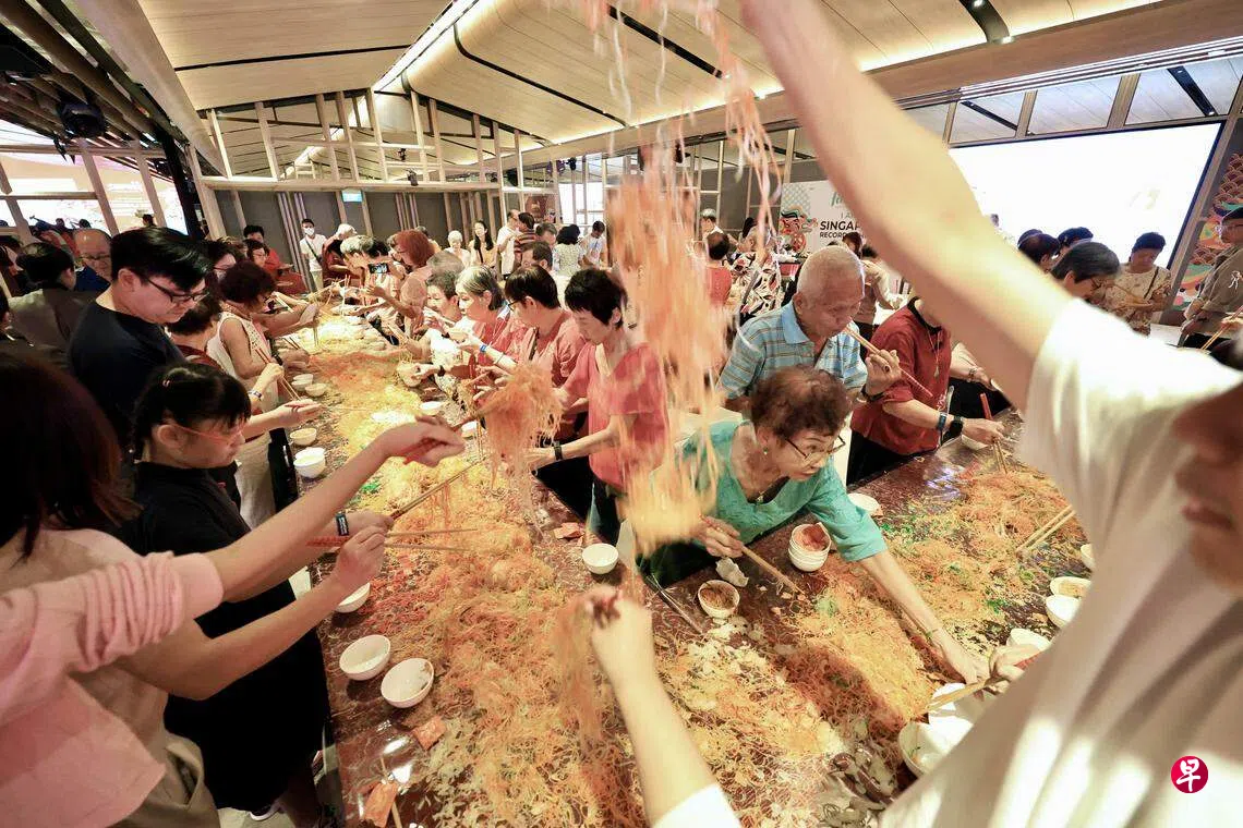 大年初八,超过300人齐聚一堂,共同捞起长23.8米、宽7.8米用数字组成的本地历来最大鱼生,创下《新加坡纪录大全》。