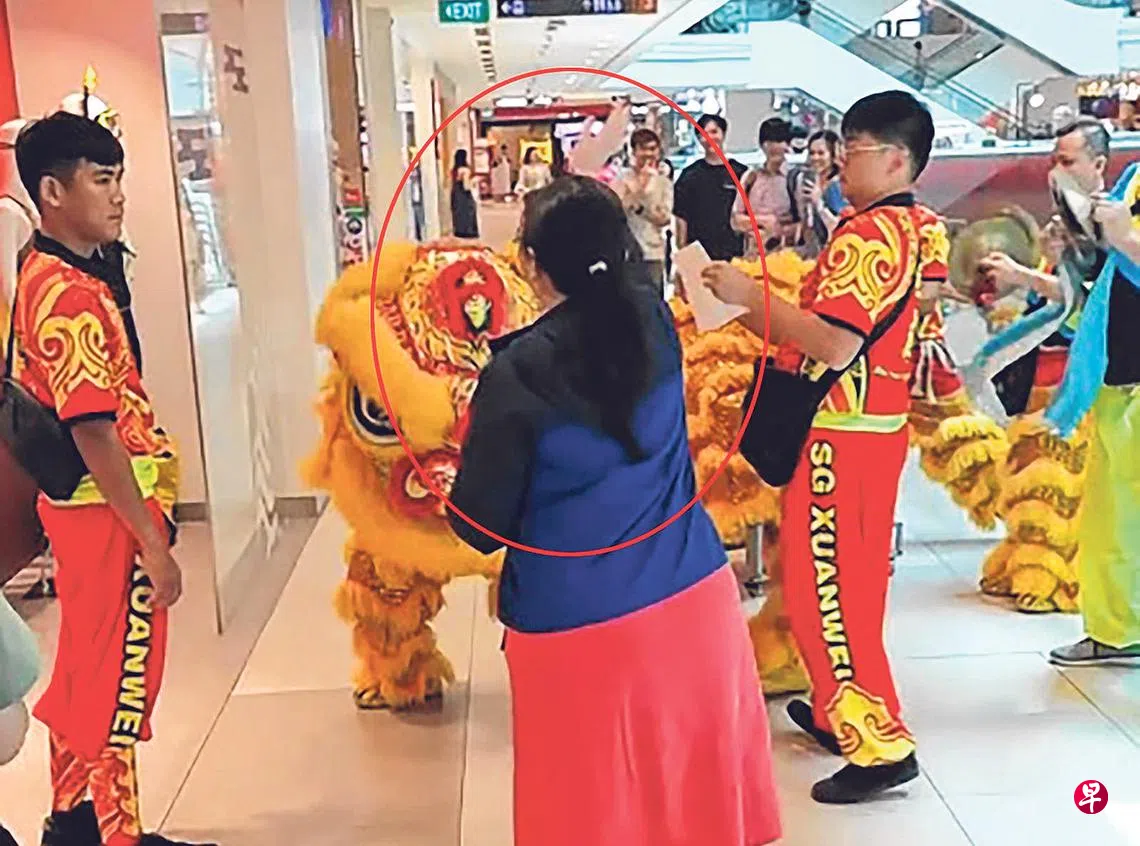 醒狮团员在狮城大厦商店舞狮助兴,岂料一名妇女突然对着舞狮大骂,结束后还继续追骂,引人侧目。