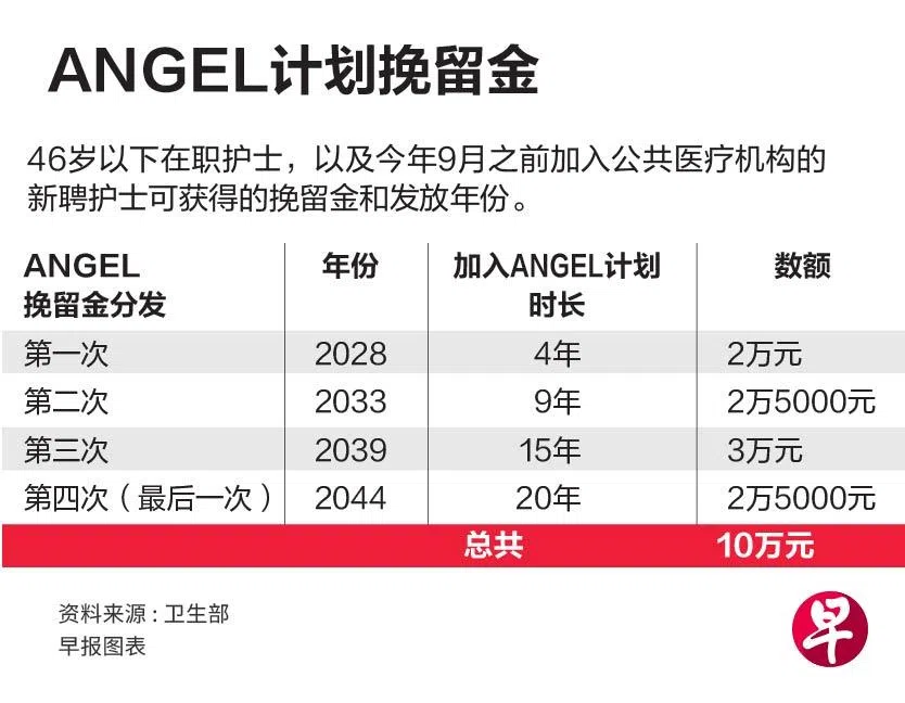 卫生部长王乙康星期二(2月20日)在新加坡国立大学医院宣布这项名为ANGEL(Award for Nurses’ Grace, Excellence and Loyalty)的挽留计划,新聘护士和46岁以下的在职护士,每四年至六年可获得2万元到3万元的挽留金。
