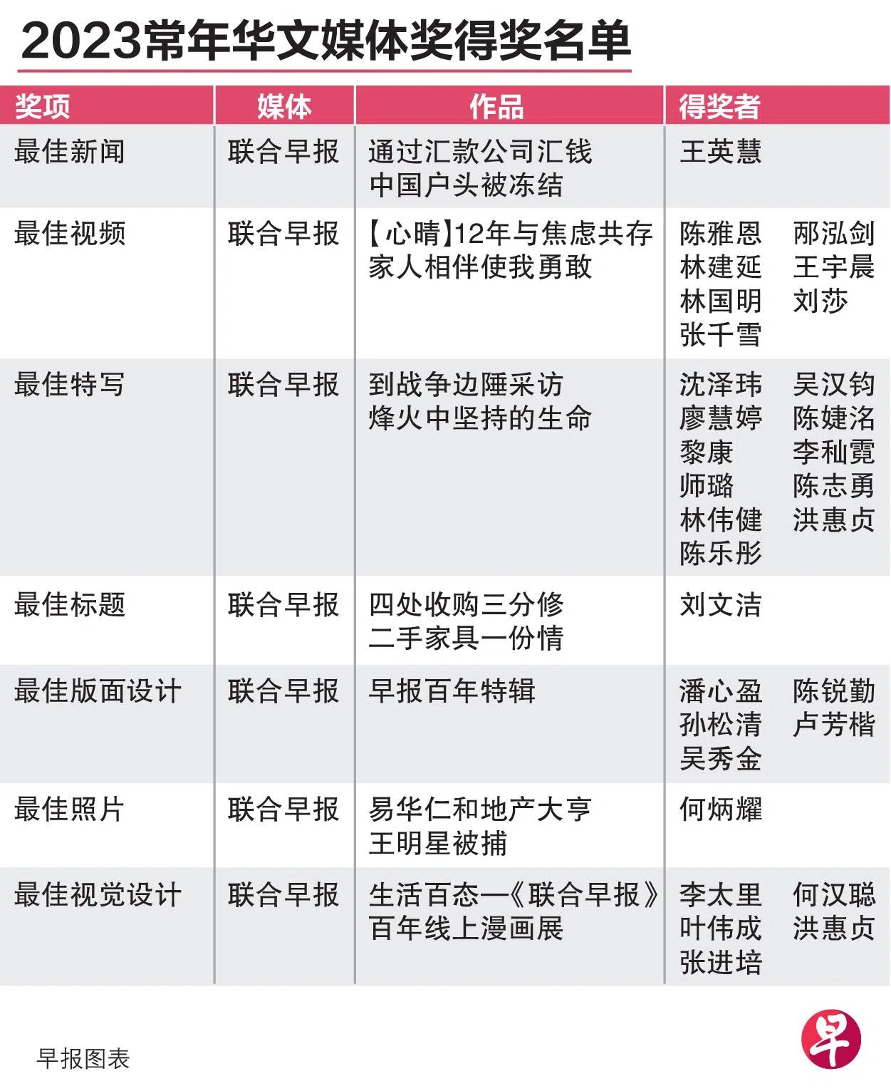新报业媒体集团华文媒体集团星期三(2月21日)举办新春团拜会,并在活动上颁发“2023常年华文媒体奖”,表扬去年表现杰出的新闻工作者。《联合早报》囊括了华文媒体奖的七项奖项。最佳评论奖本届从缺。