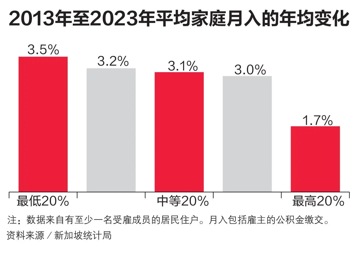 黄循财说,低收入群体过去10年的提升速度要比其他群体快。收入最低的20%居民,实际收入增长速度比中等收入者快一些,也比收入最高的20%居民快一倍。