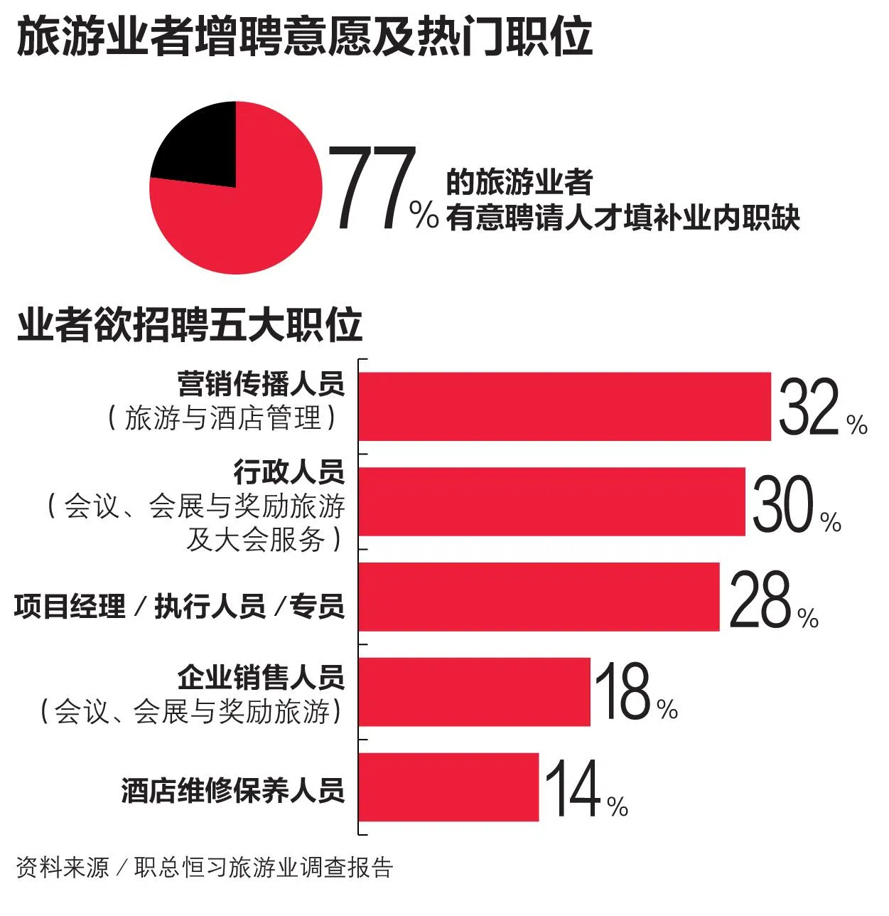 科技的运用、优质服务需求的增加,以及可持续发展等旅游业的新趋势,将为这个领域创造更多就业机会。近八成业界主管有意增聘人才填补职缺,需求高的岗位包括营销传播、行政,以及项目经理等。