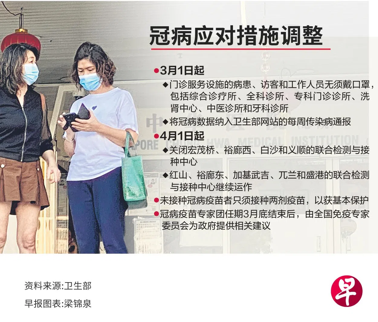 从星期五(3月1日)起,综合诊疗所和全科诊所等门诊设施的病人、访客和工作人员都不再强制戴口罩。不过,在高风险医疗环境仍必须戴口罩,病人除外。