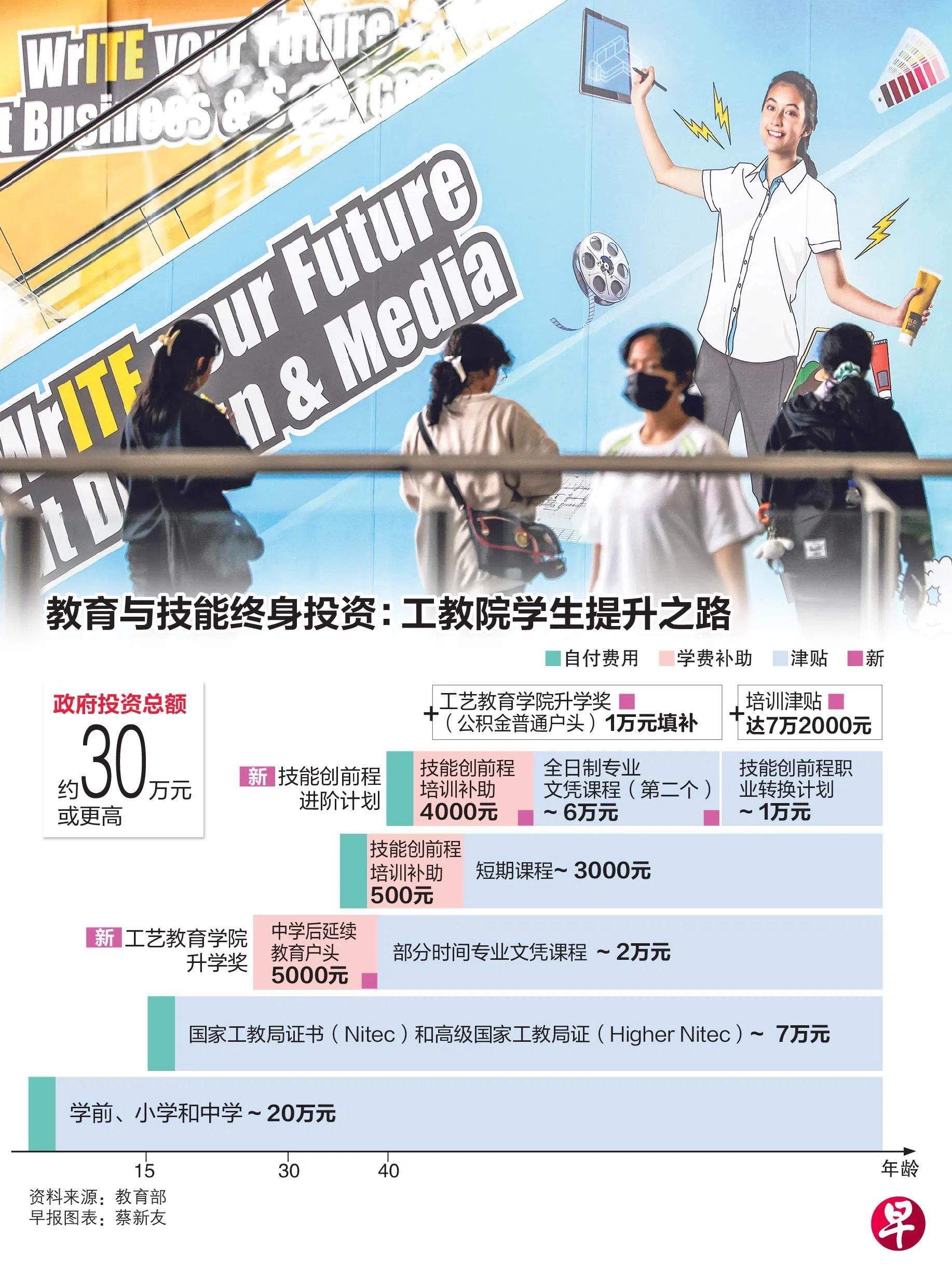 政府将为每个国民的教育与培训投入至少约30万元的资助,支持人们在人生各个阶段持续学习,加强就业能力。