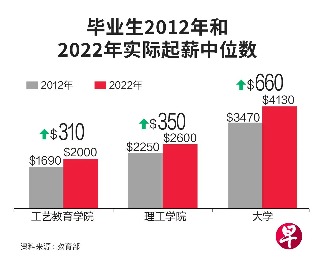 工教院毕业生的起薪与理工学院及大学毕业生的差距日益扩大。2022年,工教院毕业生的实际起薪中位数为2000元,低于理工院毕业生的2600元,以及大学毕业生的4130元。与十年前的中位数相比,工教院生的起薪只增加310元,低于理工院生的350元增幅,以及大学生的660元增幅。而工教院生与理工院生的起薪差距也从2012年的560元增加到2022年的600元;工教院生与大学生的起薪差距则从1780元扩大至2130元。