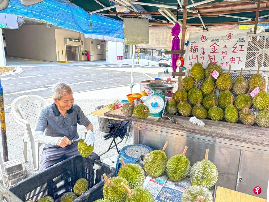 91岁老汉街边摆卖榴梿逾60年,如今尽管需要以轮椅代步仍坚持工作,每天风雨不改,由长女接送到档口,一天工作超过10个小时。