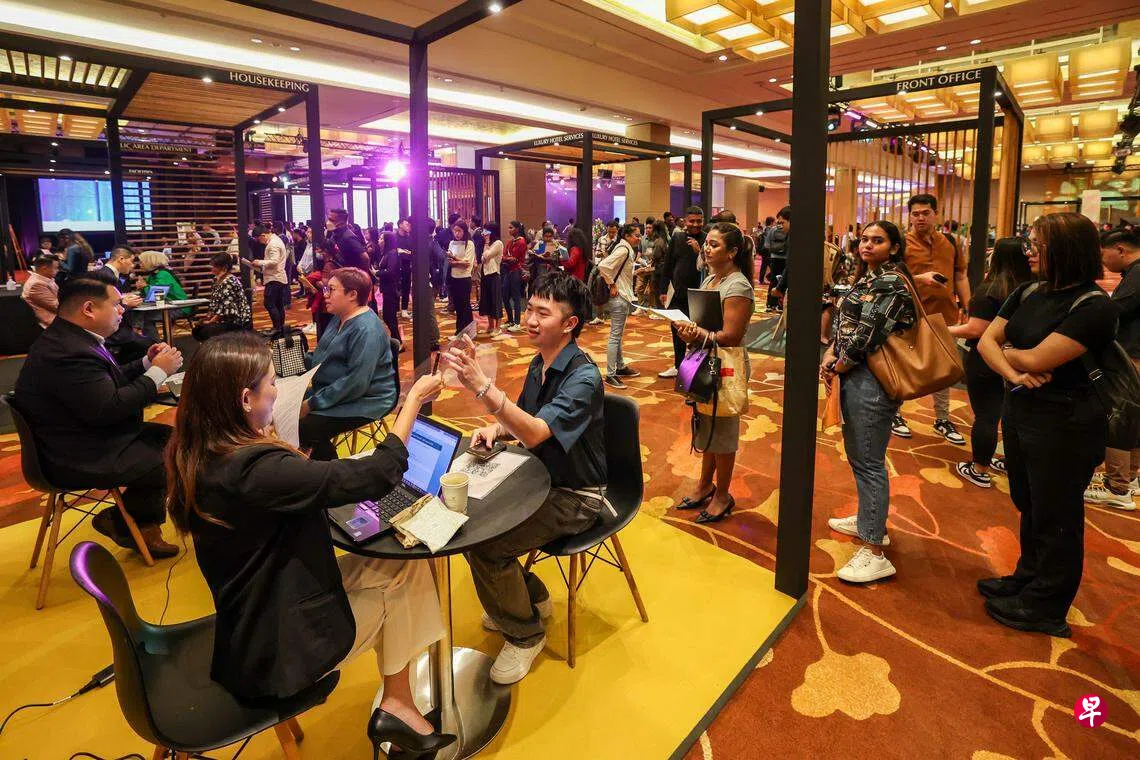 星期天(3月3日)上午10时不到,四楼的滨海湾金沙年度职业展就排起人龙。尽管今年招聘的岗位数量低于去年的1500份和前年的2000份,但主办方不认为酒店的用工需求在下降。