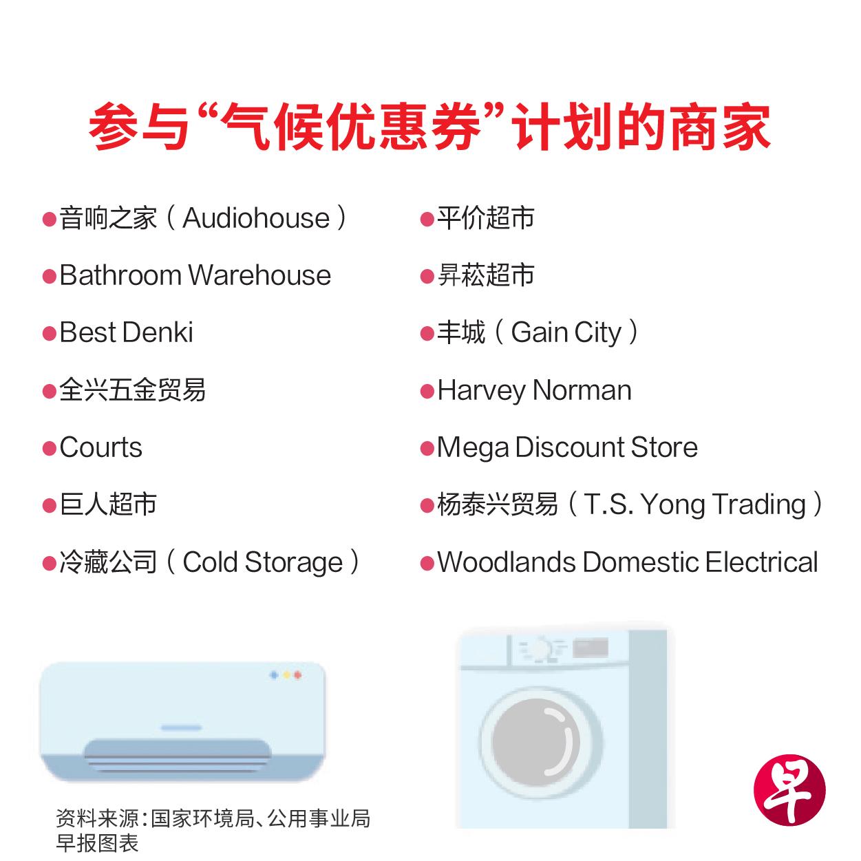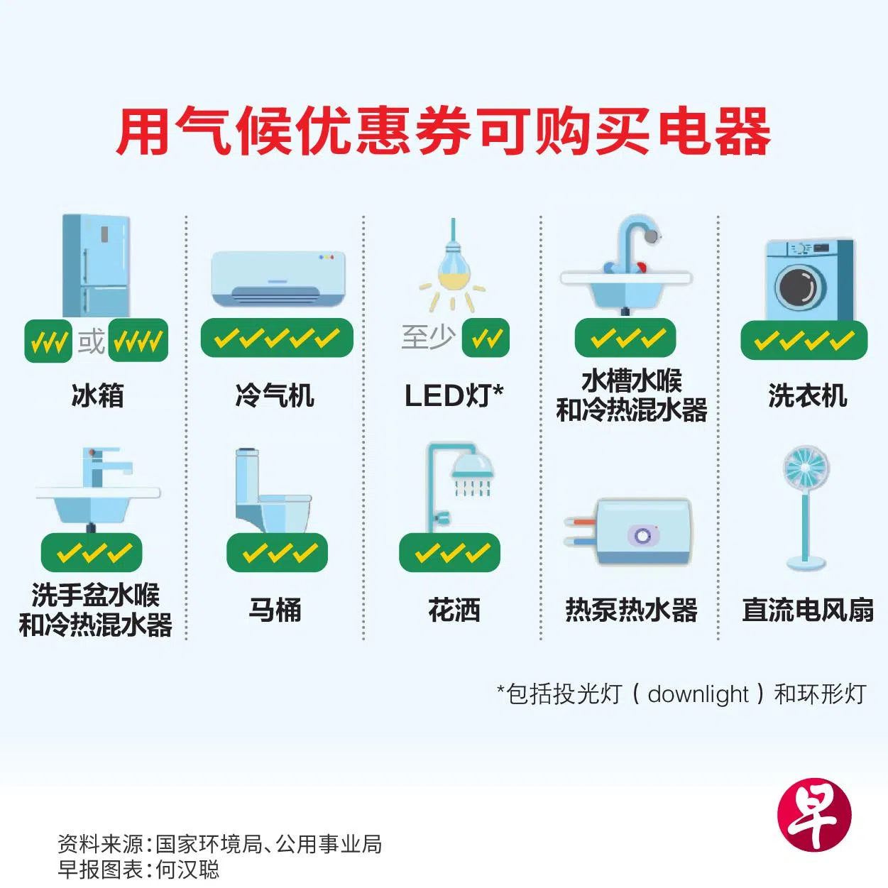 300元优惠券分2元、5元、10元和50元四种面值,可在14个参与商家经营的约300家门店使用。新增涵盖的家电和装备包括冷气机、水龙头和冷热混水器、洗衣机、马桶、直流电风扇,以及热泵热水器,它们都必须达到当局定下的节能省水标准。