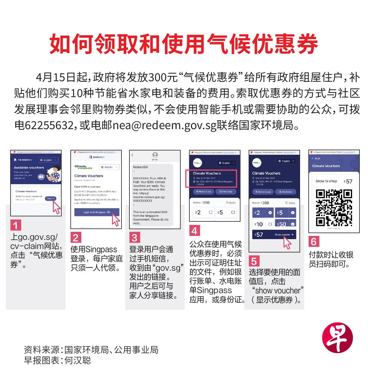 公众可从4月15日起,用Singpass上网领取气候优惠券(Climate Voucher),领取和使用方式与社区发展理事会邻里购物券类似。优惠券有效期至2027年12月31日。