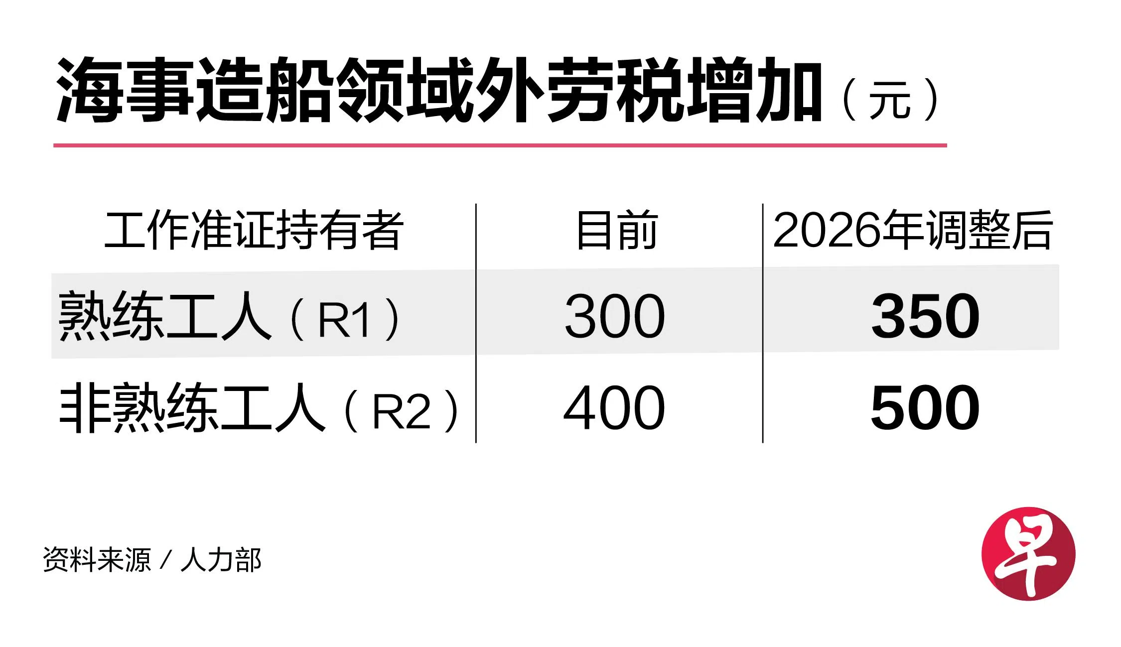 政府也将从2026年1月起,调高海事造船业的外籍劳工税,其中非熟练工人的外劳税从400元增加100元,至500元;熟练工人的外劳税则从300元调高至350元。