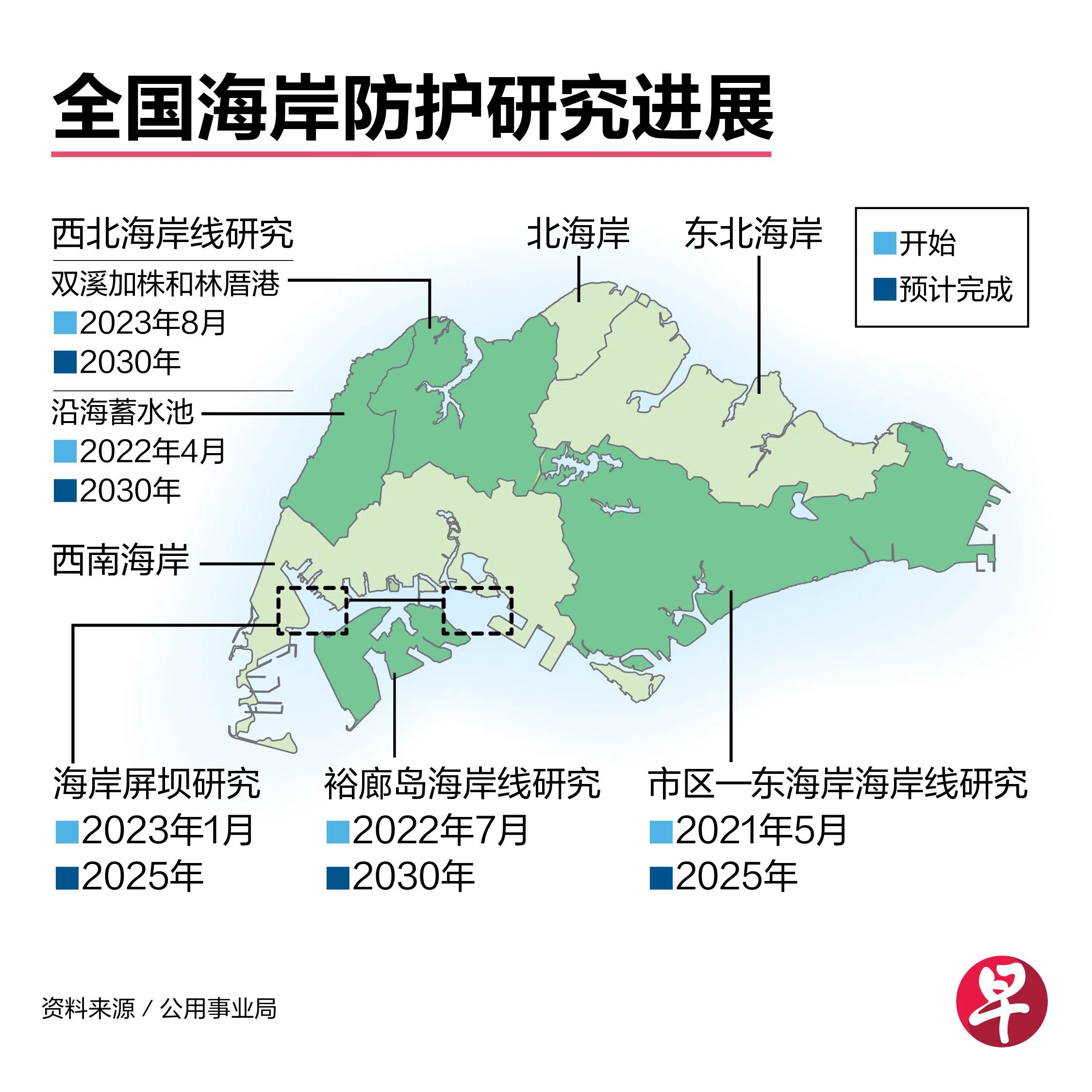 自2021年以来,公用局和相关部门陆续针对市区—东海岸、西北,以及裕廊岛海岸线展开研究。它们预计会在2025年至2030年间完成,为不同部分的海岸线制定合适的防护措施,例如筑造海堤、土堤和防潮闸。
