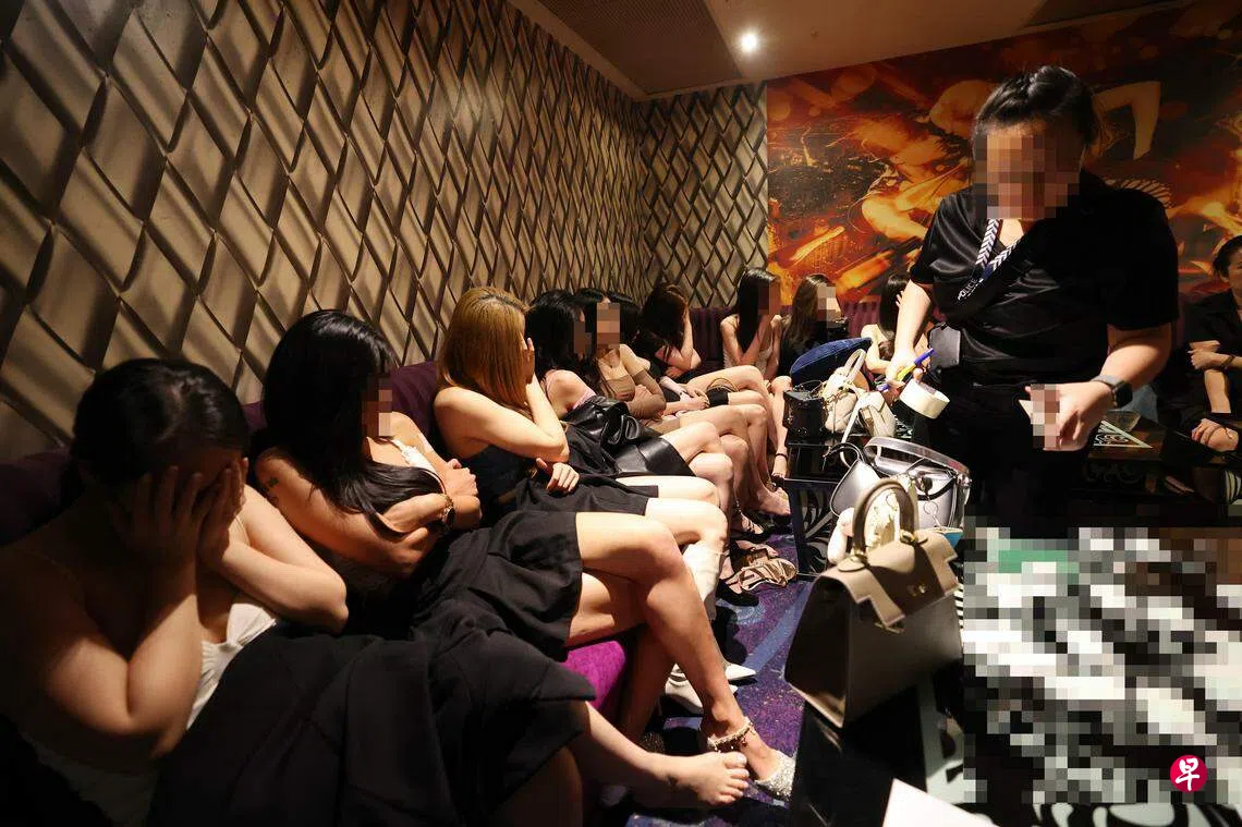 在突击卡佩芝大厦(Cuppage Plaza)KTV的行动中,约23名女子从夜店不同角落被带到一个包厢里围坐一起,执法人员逐一仔细搜查了她们的随身包包、外套和身上的衣物。