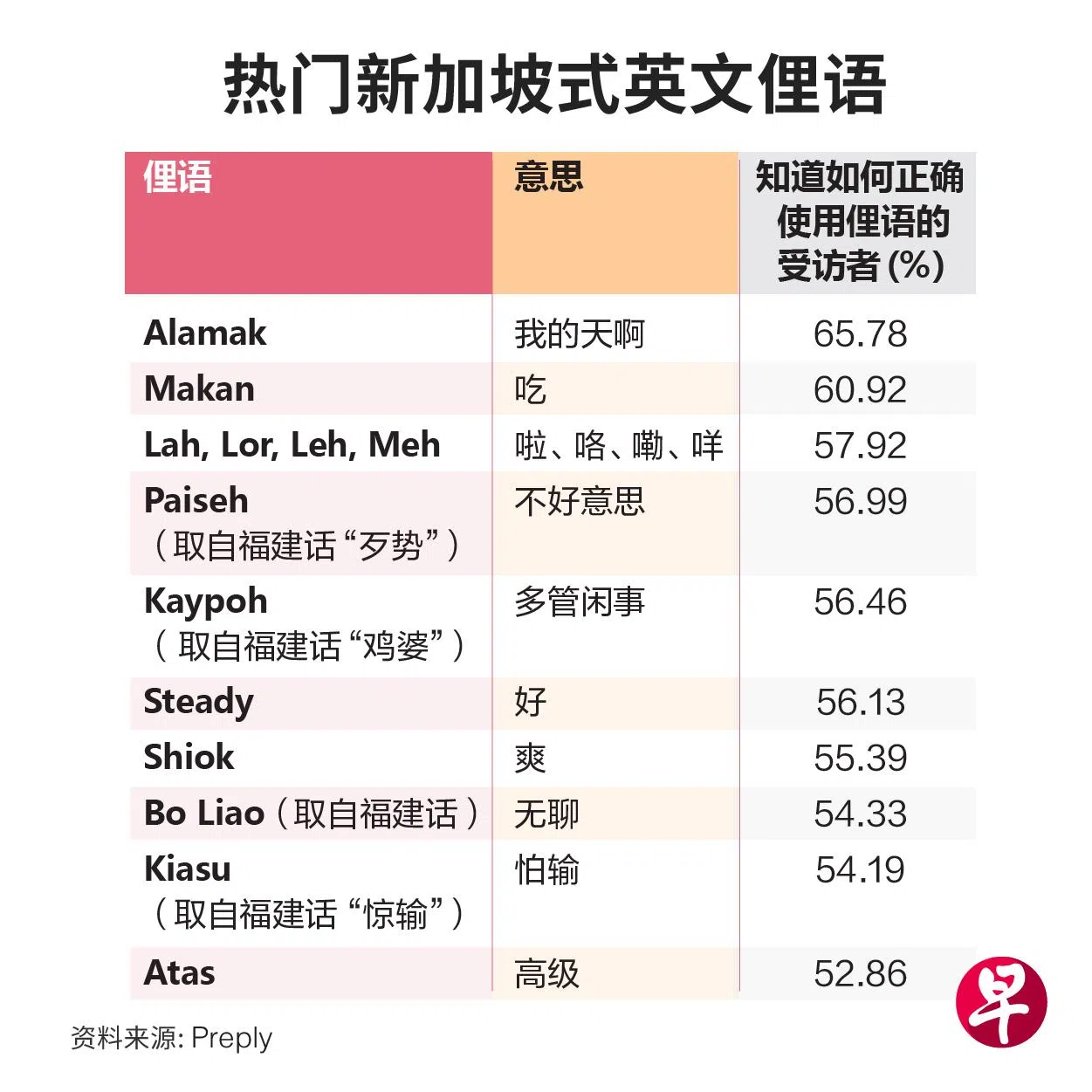 调查列出了最多新加坡人知道如何正确使用的十个新加坡式英文俚语,前五名是“Alamak”(意即“我的天”)、“Makan”(取自马来语,意即“吃”)、“Lah, Lor, Leh, Meh”(啦、咯、嘞、咩,都是语气助词)、“Paiseh”(取自福建话“歹势”,意即“不好意思”),以及“Kaypoh”(取自福建话“鸡婆”,意即“多管闲事”)。