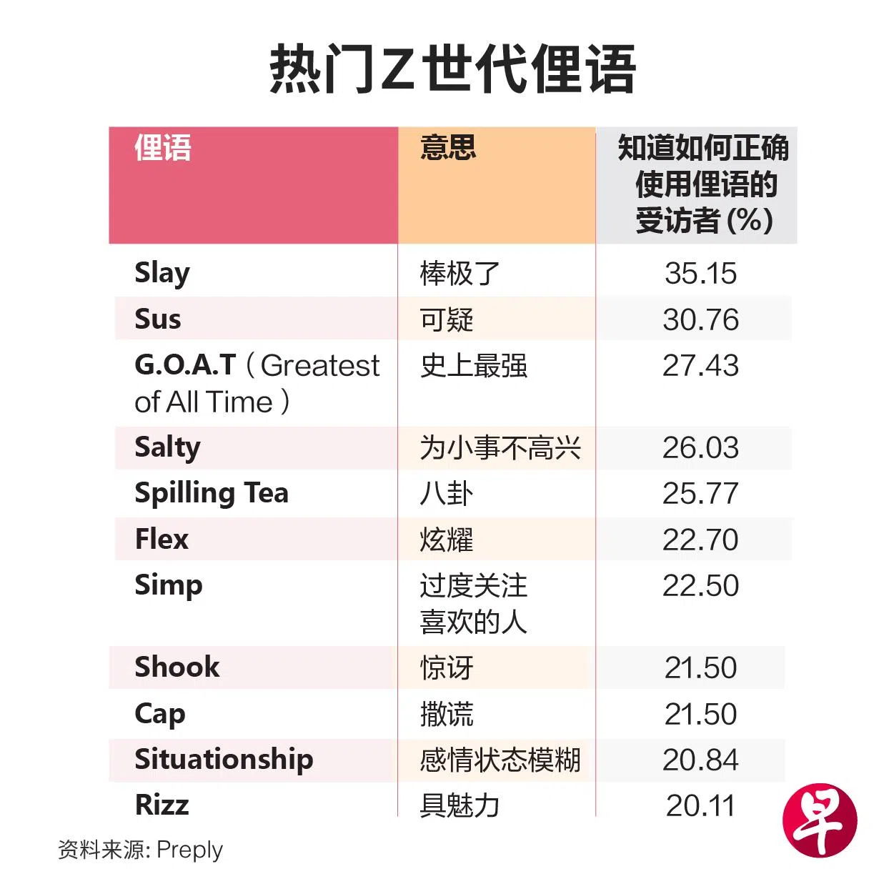 七成的受访者表示用过Z世代俚语,最多人知道如何正确使用的五个Z世代俚语是:Slay(意即“棒极了”)、Sus(意即“可疑”)、G.O.A.T(Greatest of All Time,意即“史上最强”)、Salty(意即“为小事不高兴”),以及Spilling Tea(意即“八卦”)。