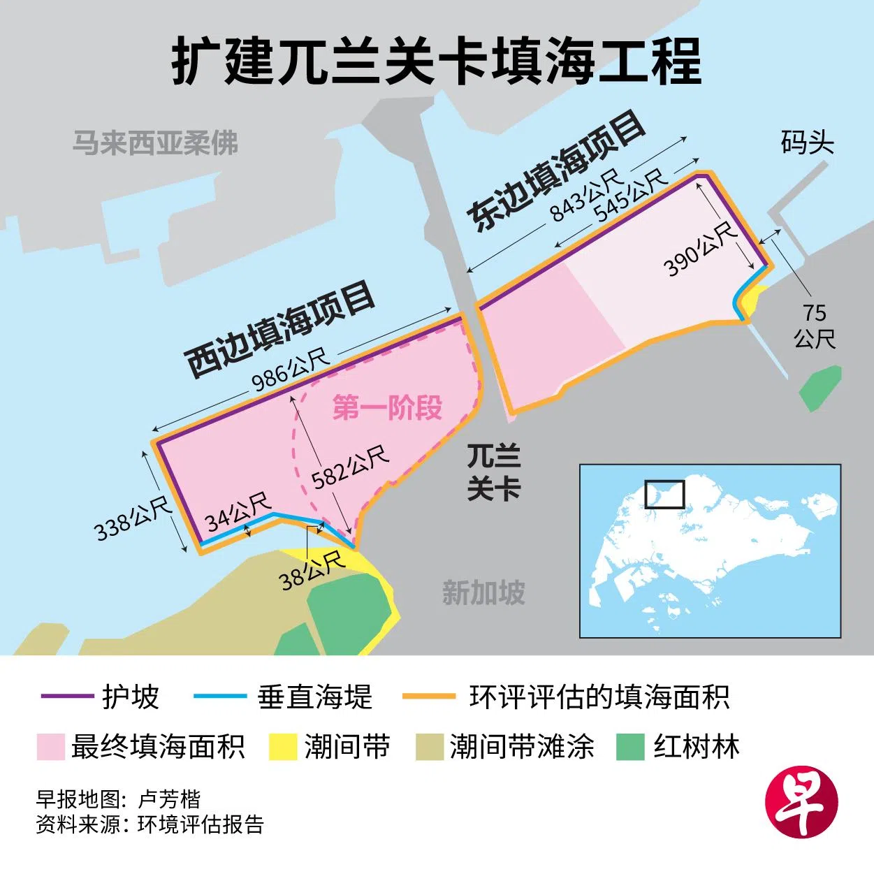 为扩建兀兰关卡,我国预计今年第三季起在兀兰北部海岸填海,约44公顷的填海工程料最迟在2029年完成。环境评估报告指出,项目西边的工程估计造成约35公顷的海床和边缘红树林丧失,但这对生物多样性的影响不大。