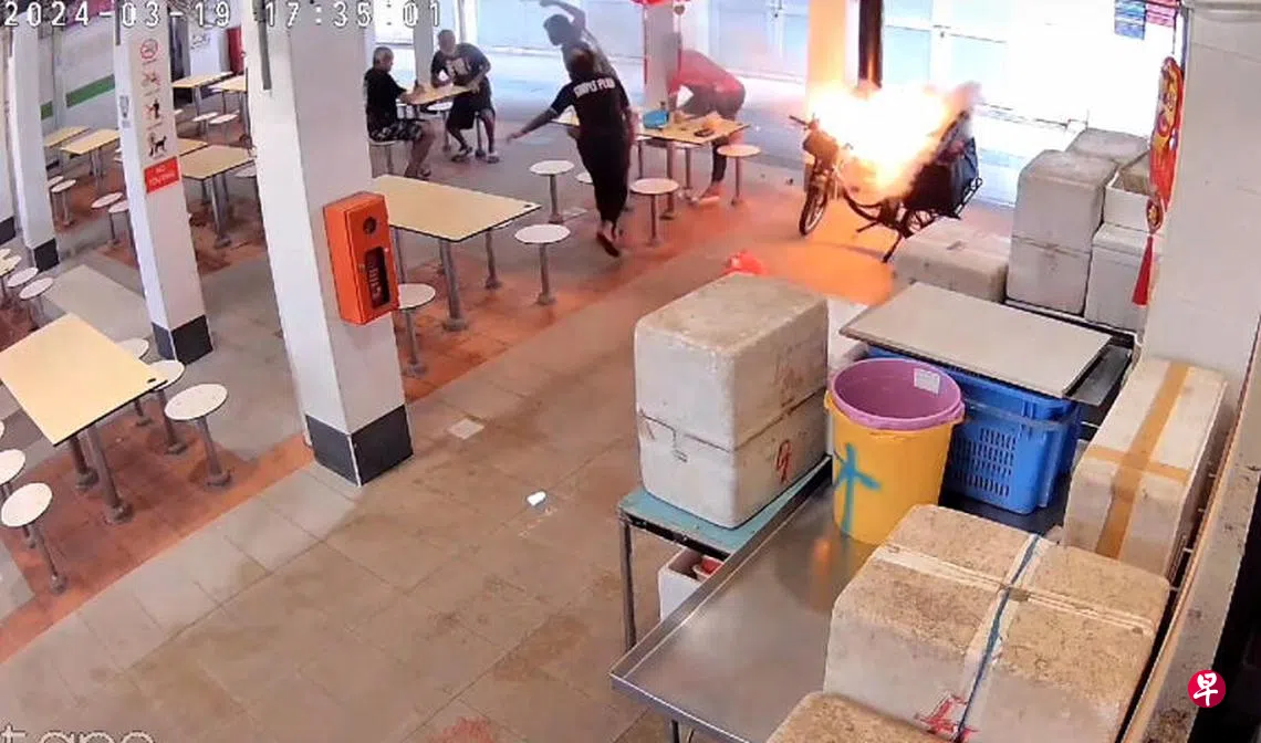 电动脚踏车电池起火,车尾的便携式煤气罐爆炸,火星飞溅,殃及附近三个摊位。