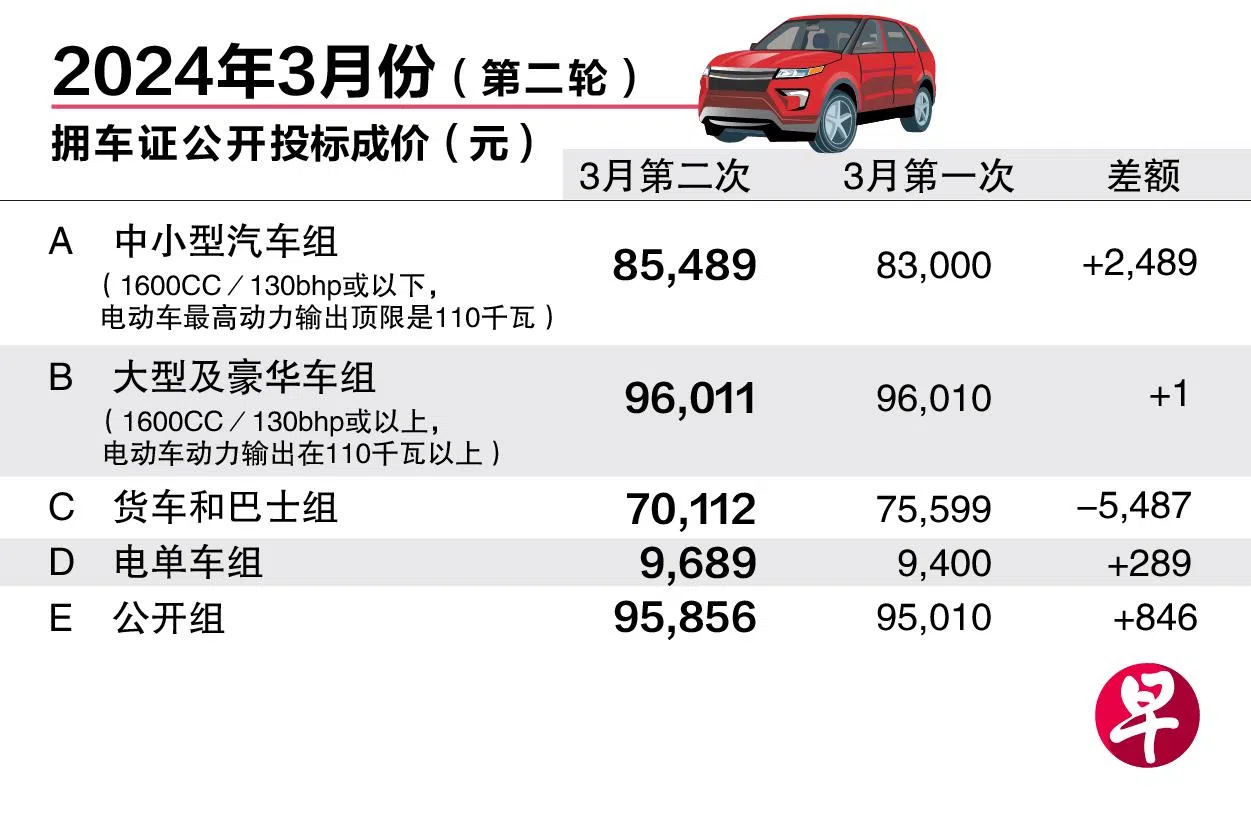 3月第二轮拥车证公开投标活动星期三(3月20日)下午结束,应对大众市场需求的中小型汽车组(A组)成价上涨2489元(3%),报8万5489元。