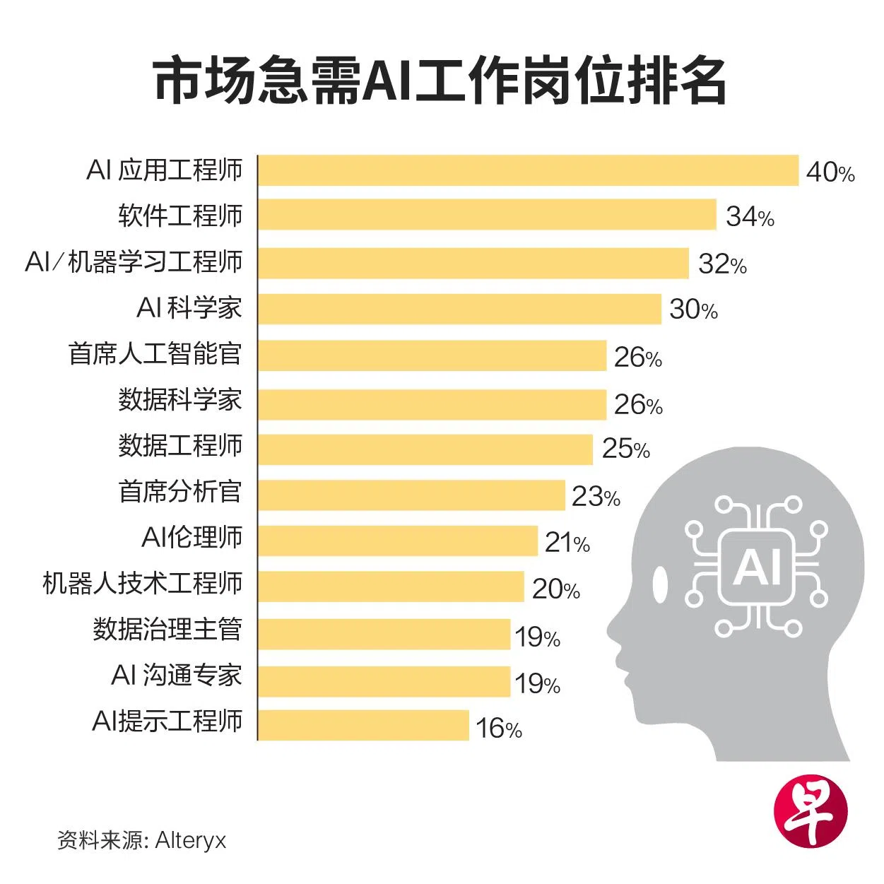 但是,受访者对增聘安全相关岗位的意愿却不明显,譬如,对招聘数据治理主管和AI沟通专家的需求只有19%,且尚未排进市场急需AI工作岗位的前10位。