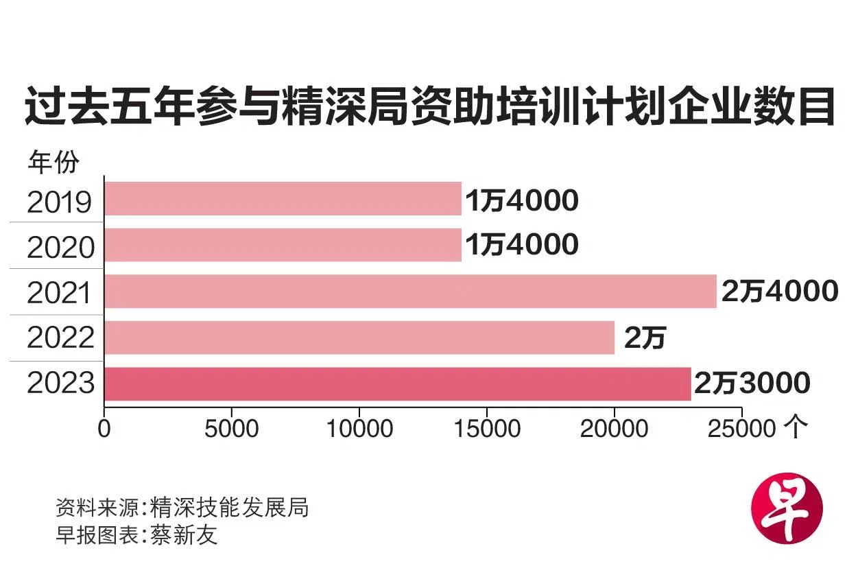 有越来越多雇主意识到,让员工持续培训以掌握职场所需技能的重要性。去年派员工去上精深技能发展局支持培训课程的企业,从2022年的约2万家,增至2万3000家,其中高达97%是中小企业。
