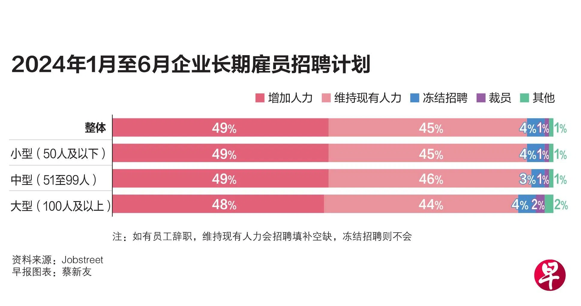 今年上半年,49%的企业计划增聘人手,不同规模的企业都有增加员工人数的计划,意味着他们有信心抓住机遇,满足不断增长的需求。45%的企业不打算扩大员工队伍,即在不大规模裁员或中断业务的情况下维持运营。