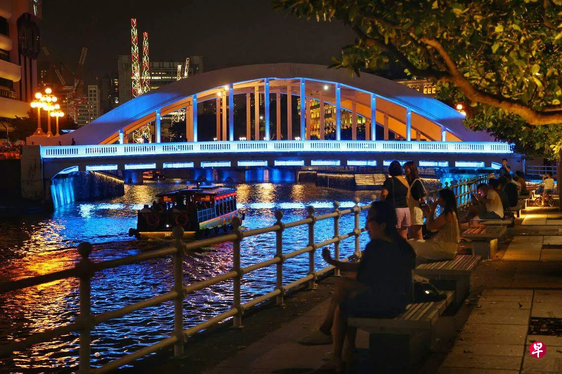 桥南路的埃尔金桥星期五(3月22日)披上蓝光,照映在新加坡河上,粼粼的蓝色波光吸引了河边路人和乘船游客的目光,大家都沉浸在迷人的夜色里。