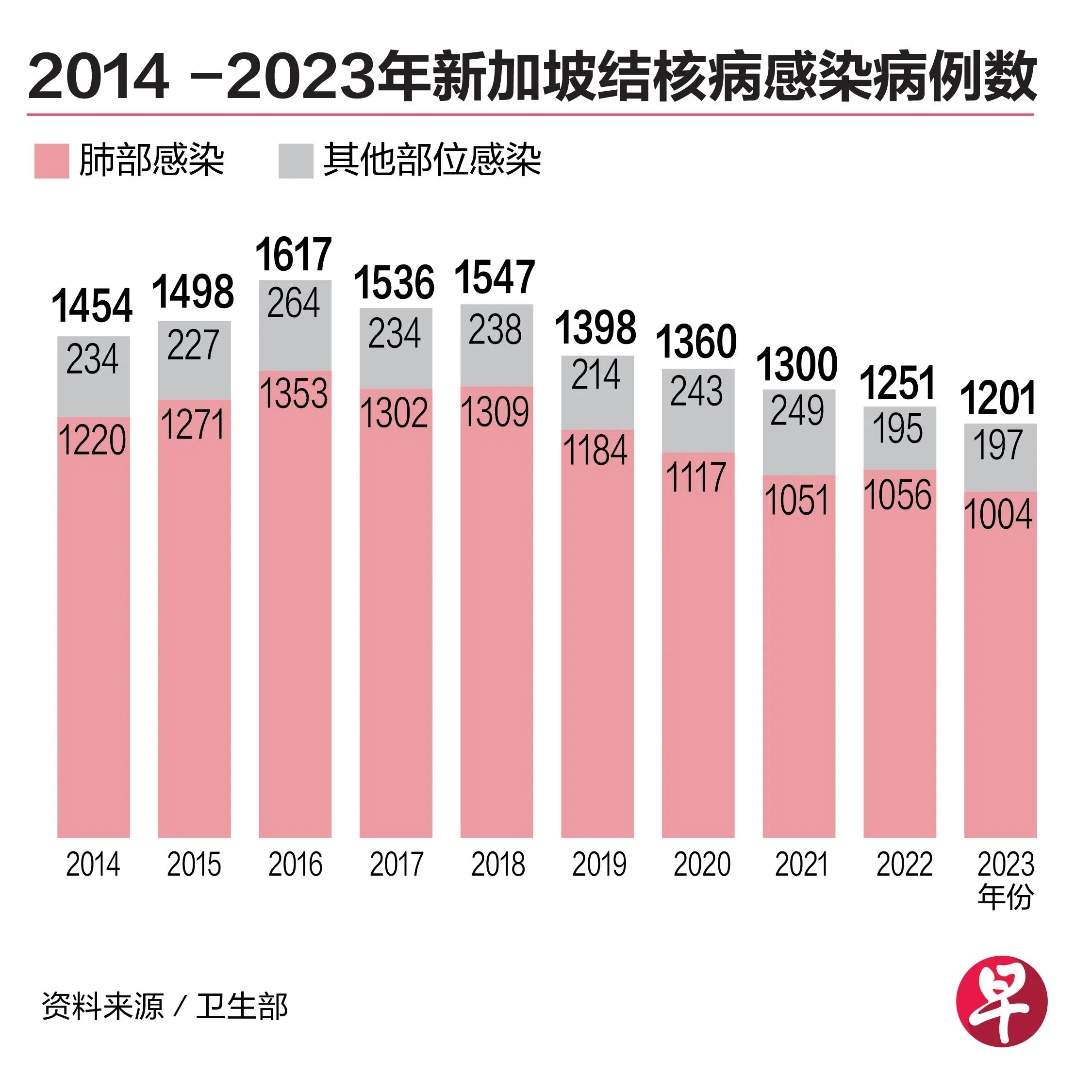 在新的活跃型结核病例中,年长者和男性仍占多数。在2023年通报的1201起新增病例中,共有939起(78.2%)为50岁及以上病患,797起(66.4%)为男性病患。2023年,新加坡居民中新增了两起耐多药结核病(multi-drug resistant tuberculosis,MDR-TB)病例。