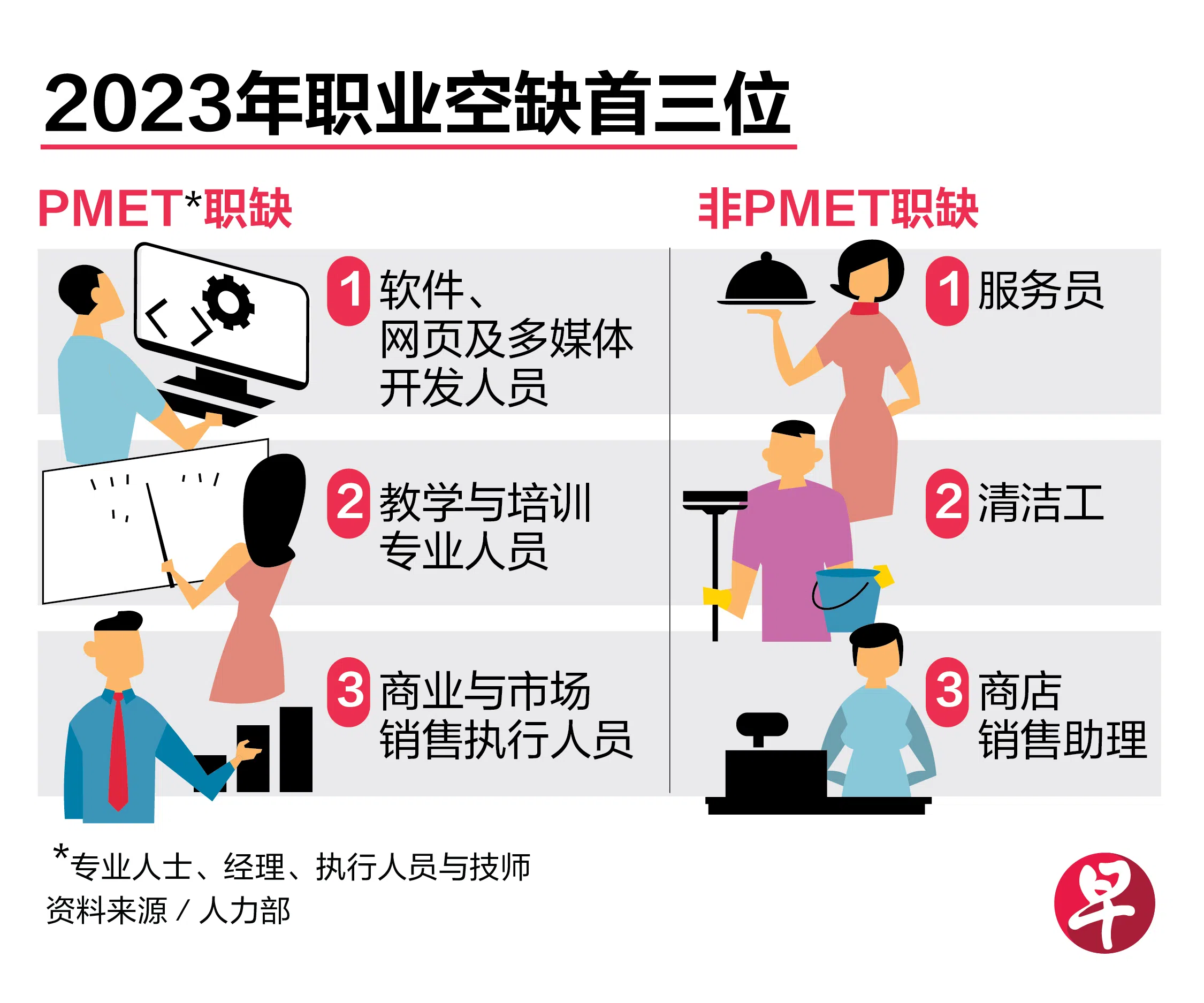 在所有PMET职缺中,以软件、网页及多媒体开发人员占最多,其他市场亟需的人才包括系统分析员、业务开发及销售专员。随着社会老龄化,我国对注册护士及助理护士的需求也日渐上升。至于非PMET职位,缺口最大的首三类是服务员、清洁工和商店销售助理,反映出本地零售及餐饮服务领域持续增长。