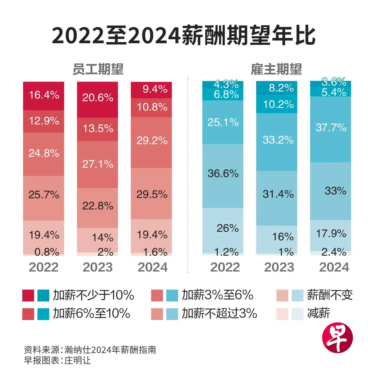 调查显示,本地雇主的预期变得更加保守,预计加薪不多于6%、维持工资不变以及预计减薪的雇主都有所增加。33%接受调查的雇主计划加薪最多3%,37.7%的雇主打算加薪3%至6%;17.9%的雇主预计薪资保持不变,高于去年报告的16%。与2023年相比,预计加薪超过6%的雇主有所减少。