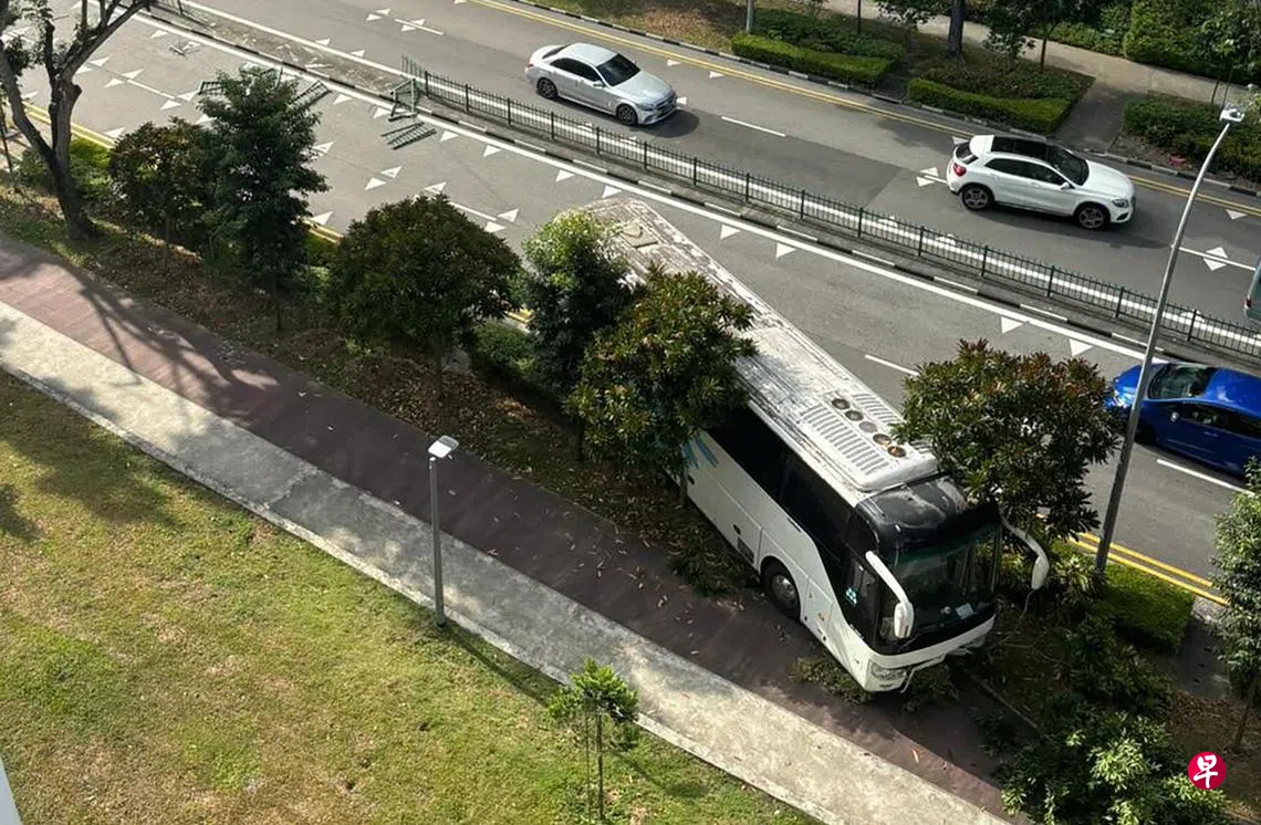 《新明日报》接获热心读者莫先生(61岁)通知,指星期二早上在家中突然听到外面传来撞击声,伴随着巴士鸣笛声,探头查看时,看见一辆私人巴士撞毁中央分界堤的栏杆,不仅冲入对面车道还冲上草坪,最后因撞到树才停下。