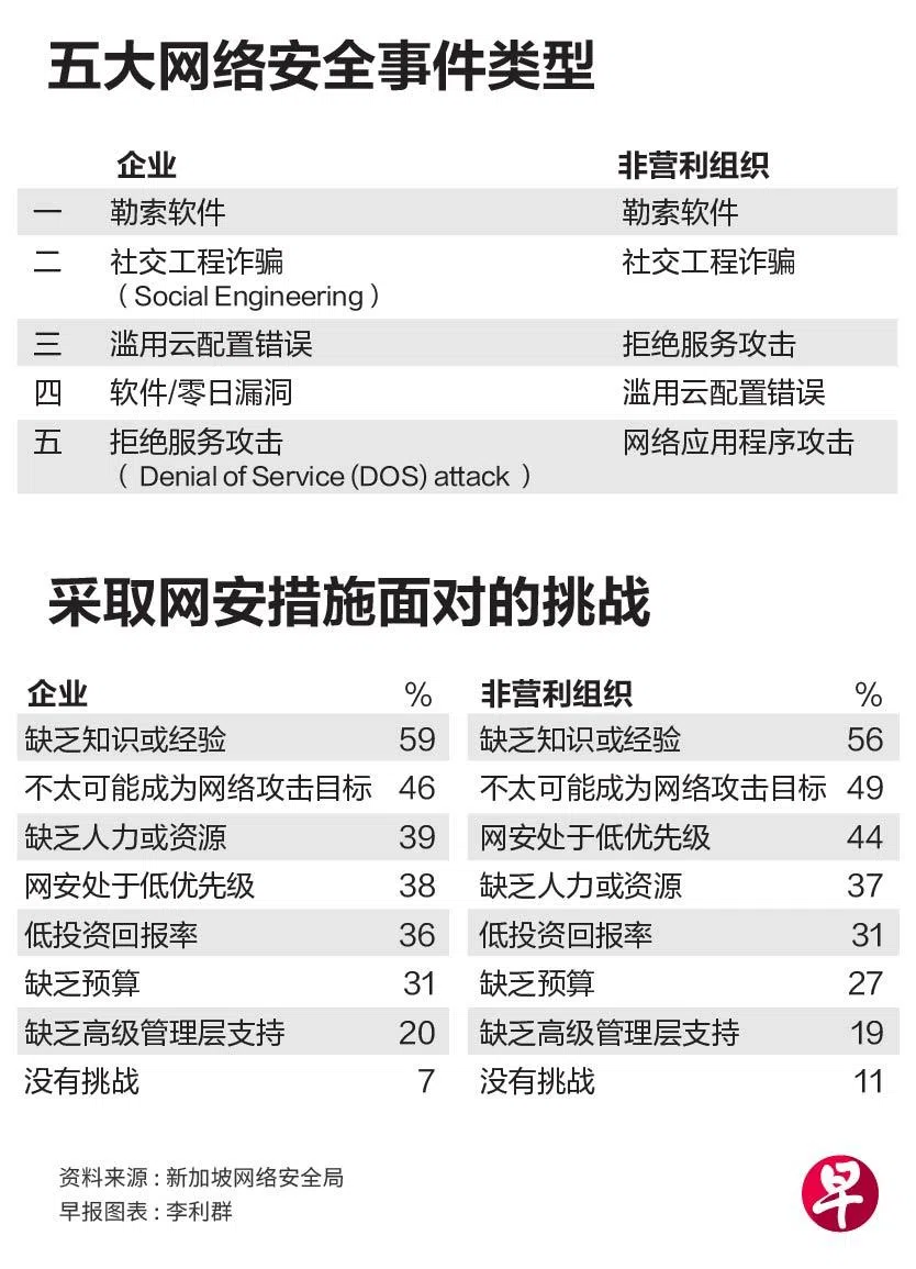 网安隐患随着科技发展越来越无孔不入,新加坡网络安全局首个本地网安健康报告显示,虽然多数企业和非营利组织已采取七成的网安措施,但网安局认为仍不足以防范所有网络威胁,必须全面落实所有必要措施。