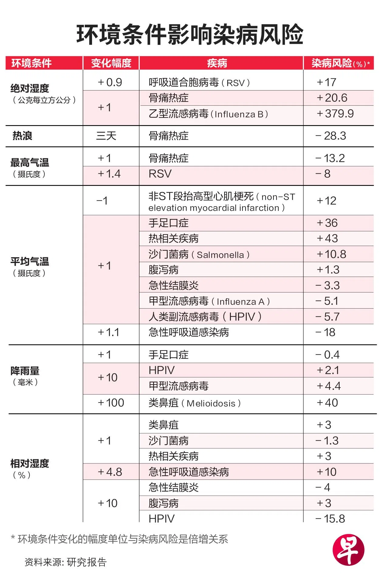 研究发现,绝对潮湿上升一公克每立方公分,感染骨痛热症和乙型流感病毒(Influenza B virus)的风险分别增加20.6%和379.9%。