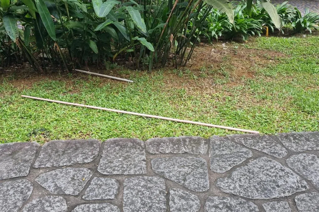 工人在安装围网时,不慎让一根金属支架从组屋边缘滚落,支架从屋顶的沟缝中坠下,砸伤了胡永财。