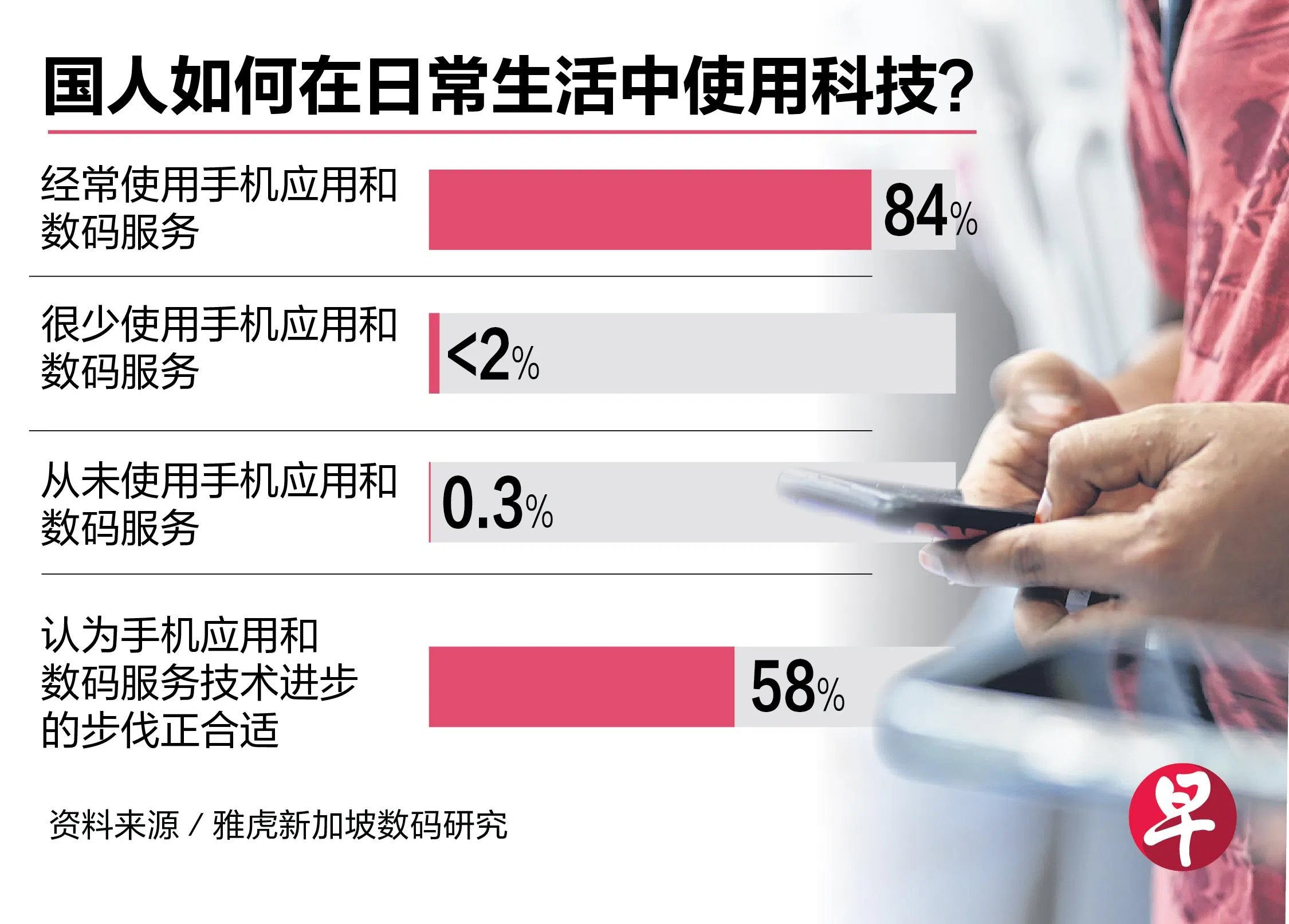 研究报告显示,84%的国人在日常生活中基本跟上科技发展的步伐,并经常使用手机应用和数码服务。近六成的人认为,这方面的科技正以合适的速度在进步,带来的好处大于挑战,还有54%的人认为数码服务提高他们的生活质量。