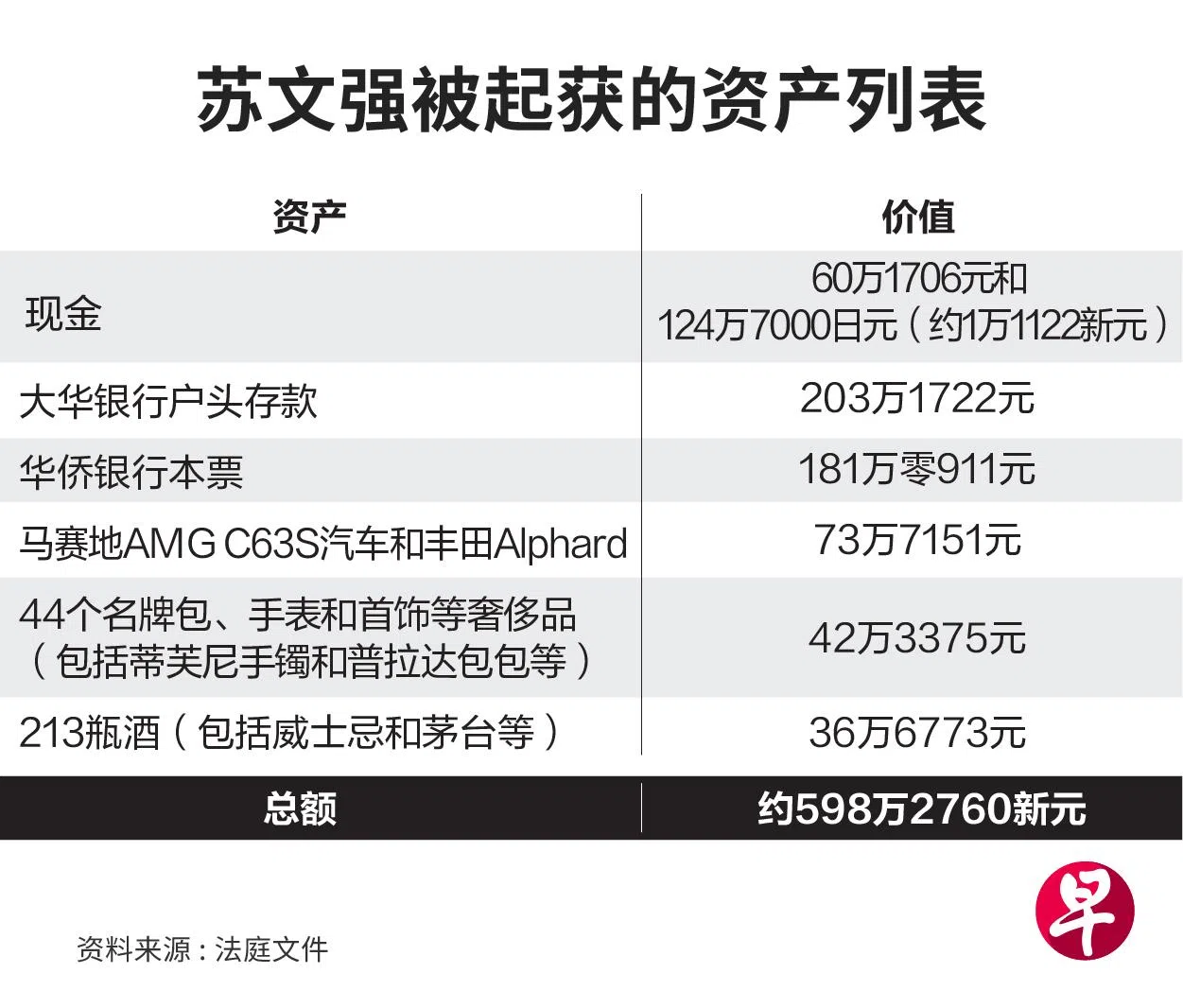 苏文强被起获价值共约597万1638新元和124万7000日元的资产,其中包括现金、车辆、奢侈品和名酒。