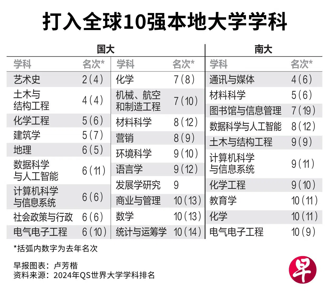 国大其他排前10名的课程包括土木与结构工程(第四)、化学工程(第五),以及在各自领域同样取得第六排名的计算机科学与信息系统、数据科学与人工智能。