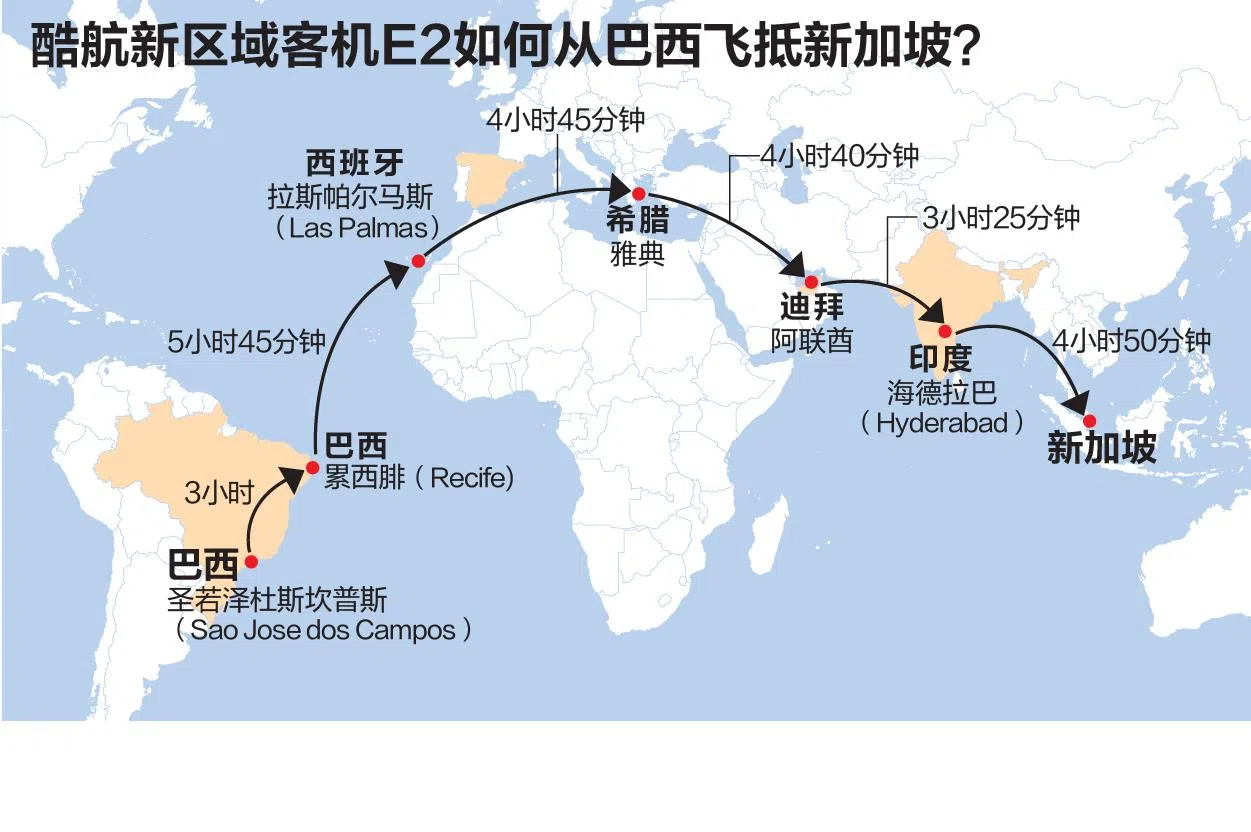酷航接收的首架E190-E2型客机(简称E2)将在星期五(12日)从圣若泽杜斯坎普斯起飞,下星期一(15日)抵达新加坡樟宜机场。由于E2是个区域客机,飞行时间最长约六小时,因此途中要在另五个城市着陆添油,同时让机组人员休息。