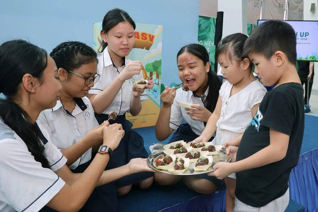来自立德小学的学生在摊位上分享处理剩余食物的方法,如利用剩菜烹制其他菜肴减少浪费,以及将厨余垃圾堆肥,为盆栽和社区花园提供养料等。美雅小学的学生向居民介绍学校的无土栽培菜园,并分享在生活中节约用水的小技巧。