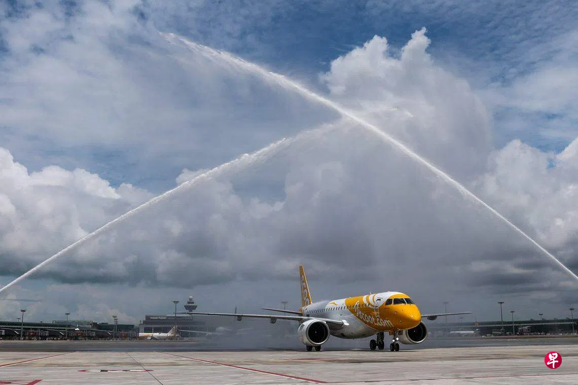 经过遥远的航程,本地廉价航空酷航的第一架巴西航空工业公司制造的E190-E2型客机,顺利从南美洲的巴西飞抵赤道上的新加坡,机场以传统“过水门”仪式为它接风洗尘。
