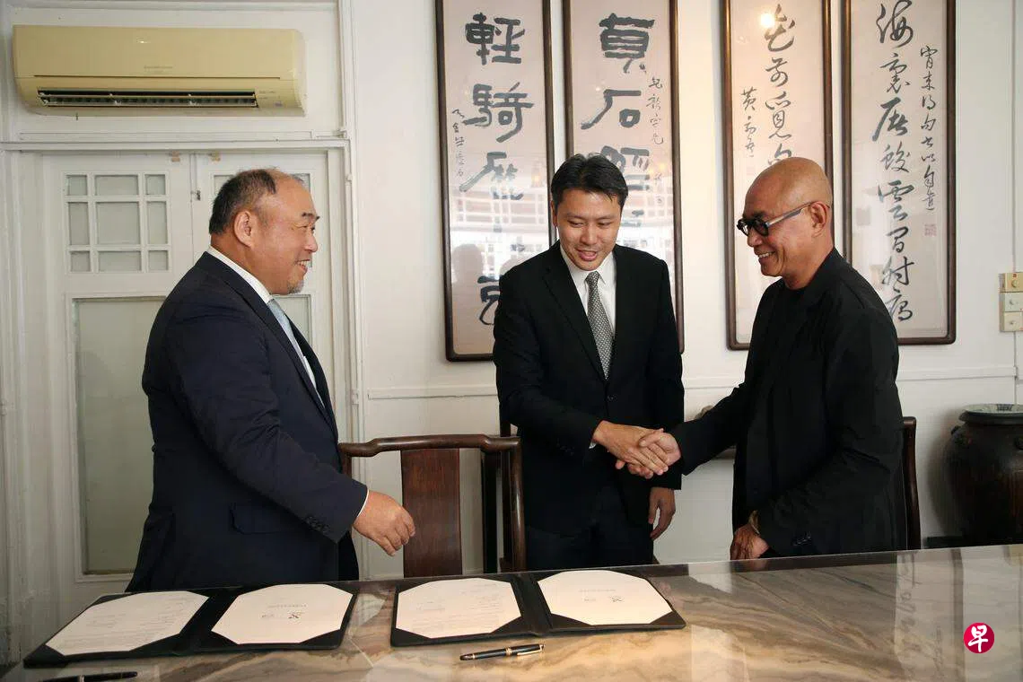 天猛公艺术基金会创始人陈克湛与亚欧基金会(Asia-Europe Foundation)执行董事森川徹,星期二(4月16日)在裕廊集选区国会议员黄伟中的见证下,签署谅解备忘录。