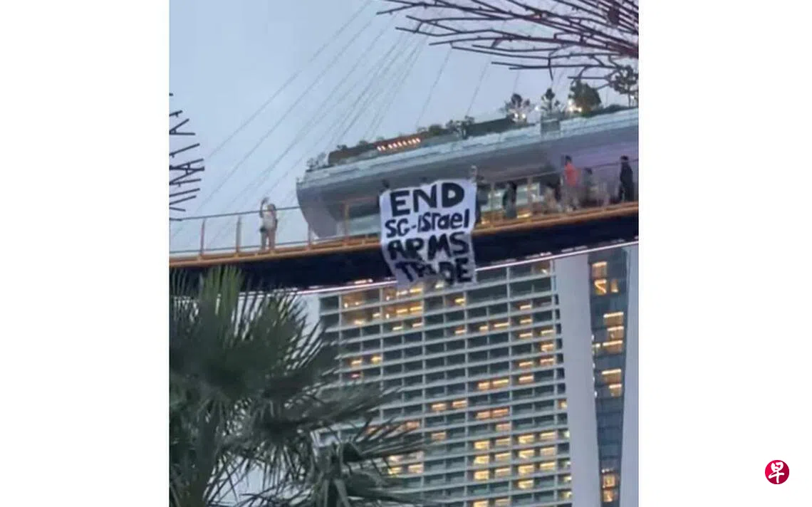 根据网上流传的照片,一组人拿着写上“停止新加坡和以色列武器贸易”的布条,站在滨海湾花园空中走道。