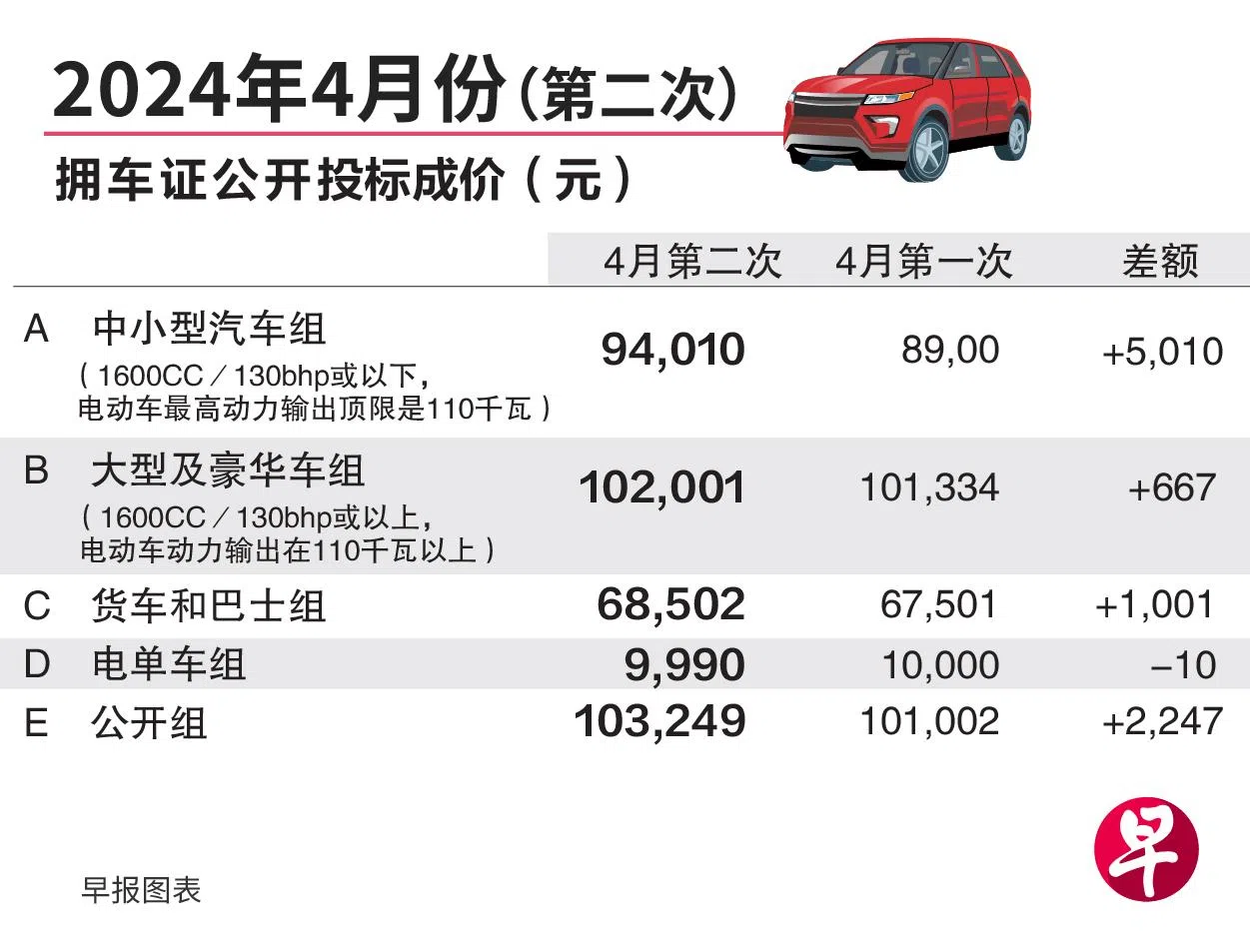 4月第二轮拥车证公开投标活动星期三(4月17日)下午结束,应对大众市场需求的中小型汽车组(A组)成价上升5010元(5.6%),报9万4010元,逼近去年11月首轮的9万5689元。
