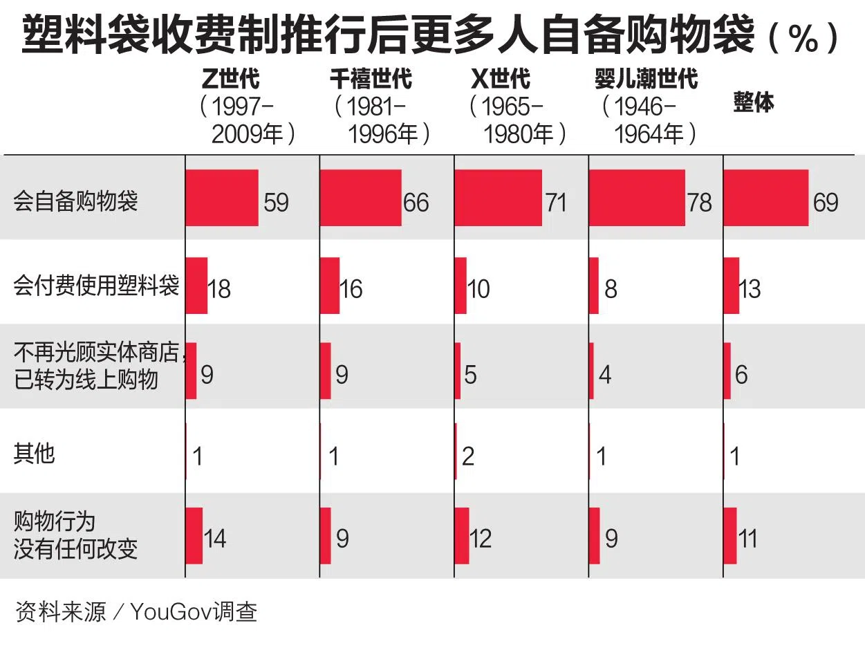 根据YouGov星期四(4月18日)公布的最新调查结果,自我国推行塑料袋收费制以来,在婴儿潮世代受访者中,78%的人说会自备购物袋,是各世代当中比率最高的,X世代会这么做的人有71%、千禧一代(即Y世代)有66%,Z世代有59%。