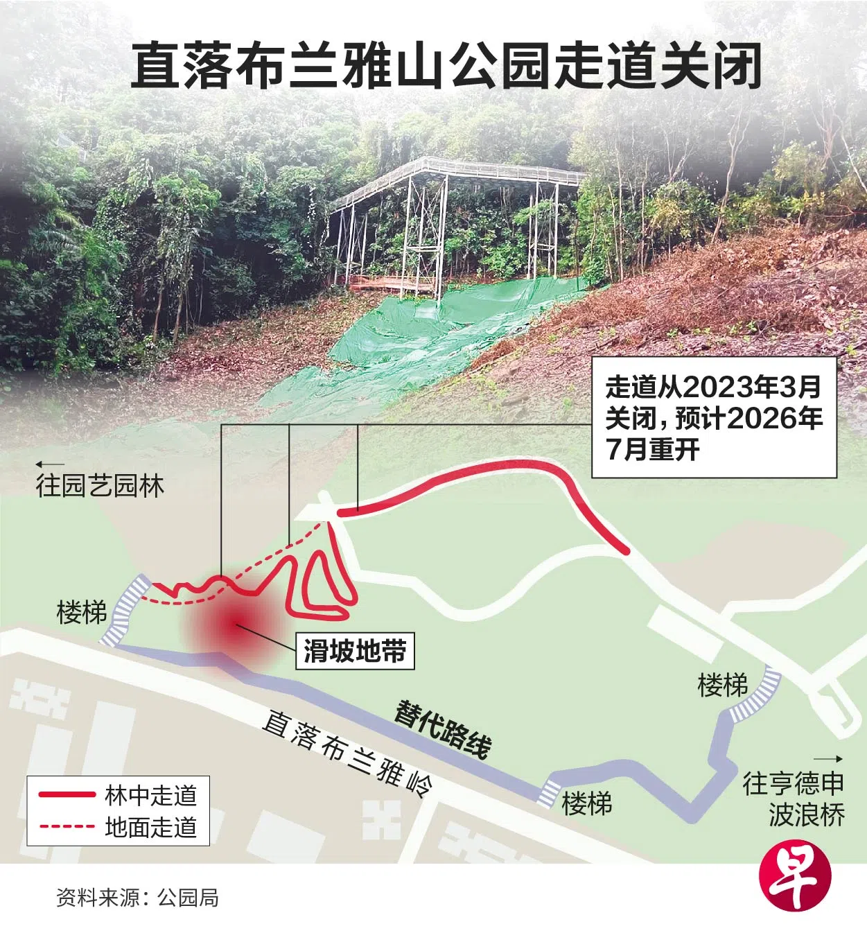 国家公园局园林处高级署长蔡艳玲回复《联合早报》询问时说,直落布兰雅山公园去年2月28日因持续下大雨,发生边坡失稳(slope failure),所以必须关闭一些地方修复。