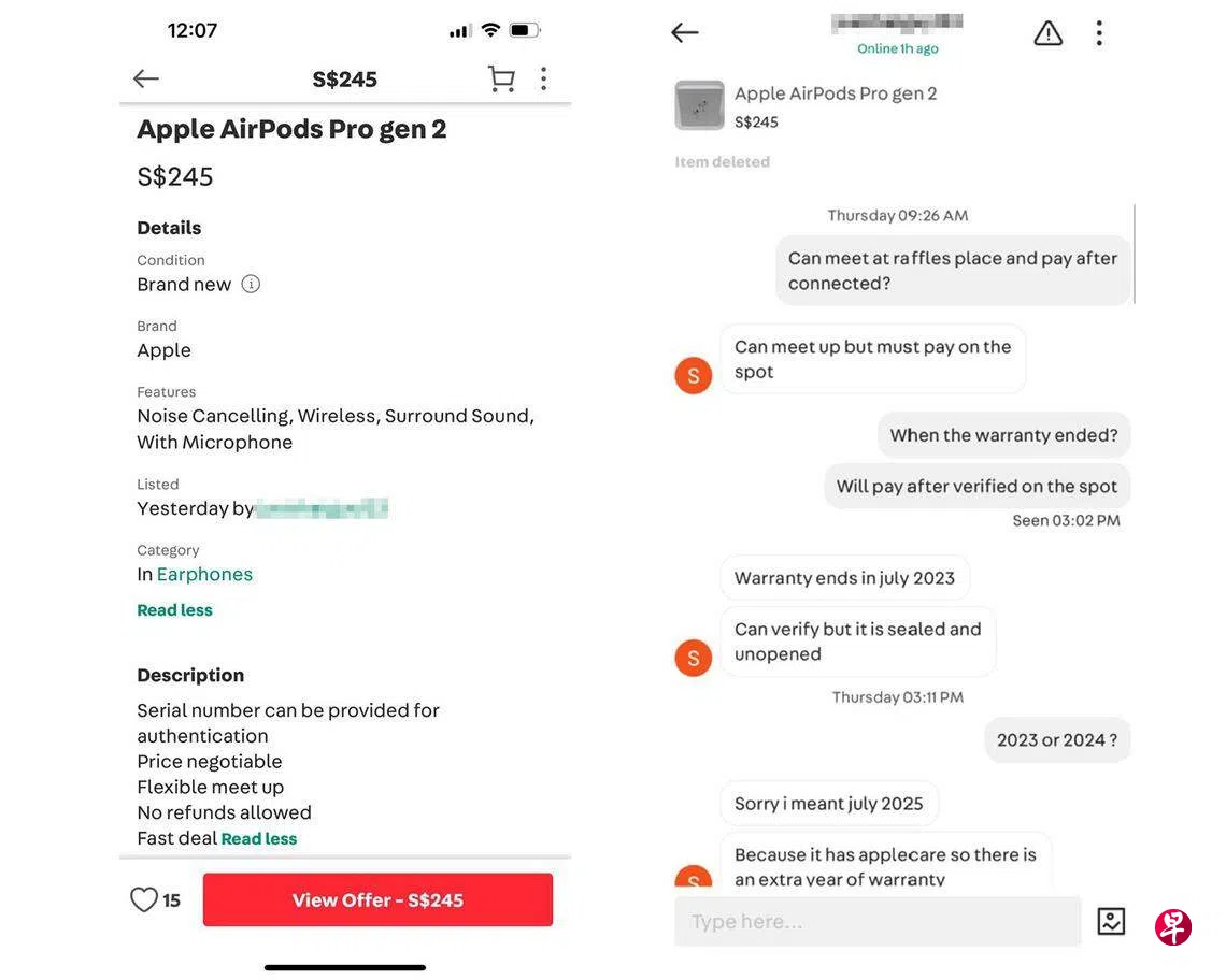 王姓工程师(30岁)向《联合早报》申诉,他于3月28日在Carousell看到苹果耳机AirPods Pro 2的转售帖子。由于耳机不巧坏了,卖家评价良好且耳机仅卖245元,比市价便宜约100元,于是便主动联系对方。